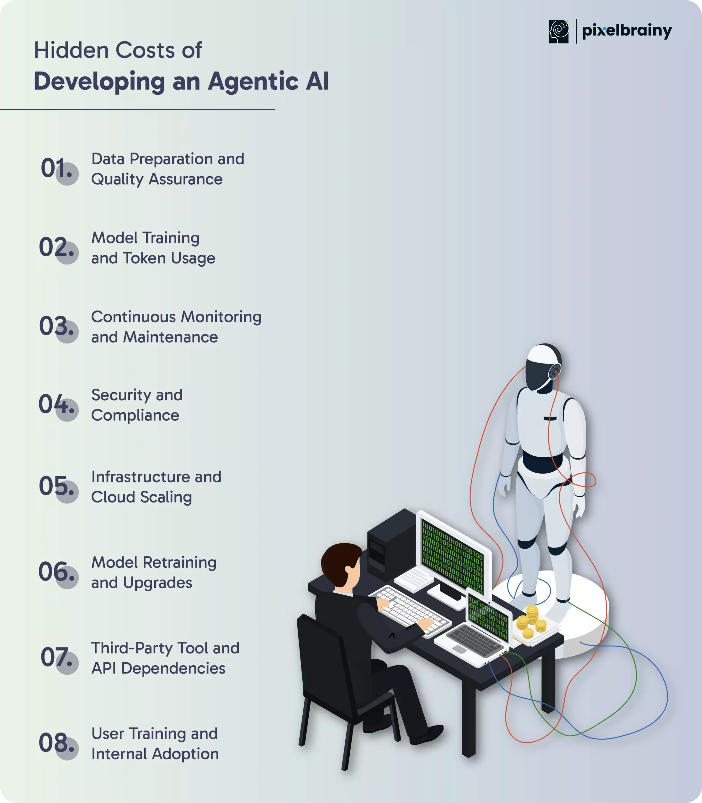 Understanding these unseen elements ensures that your total cost to develop Agentic AI is realistic and manageable. Below are the most common hidden costs that businesses should consider before starting an Agentic AI project.