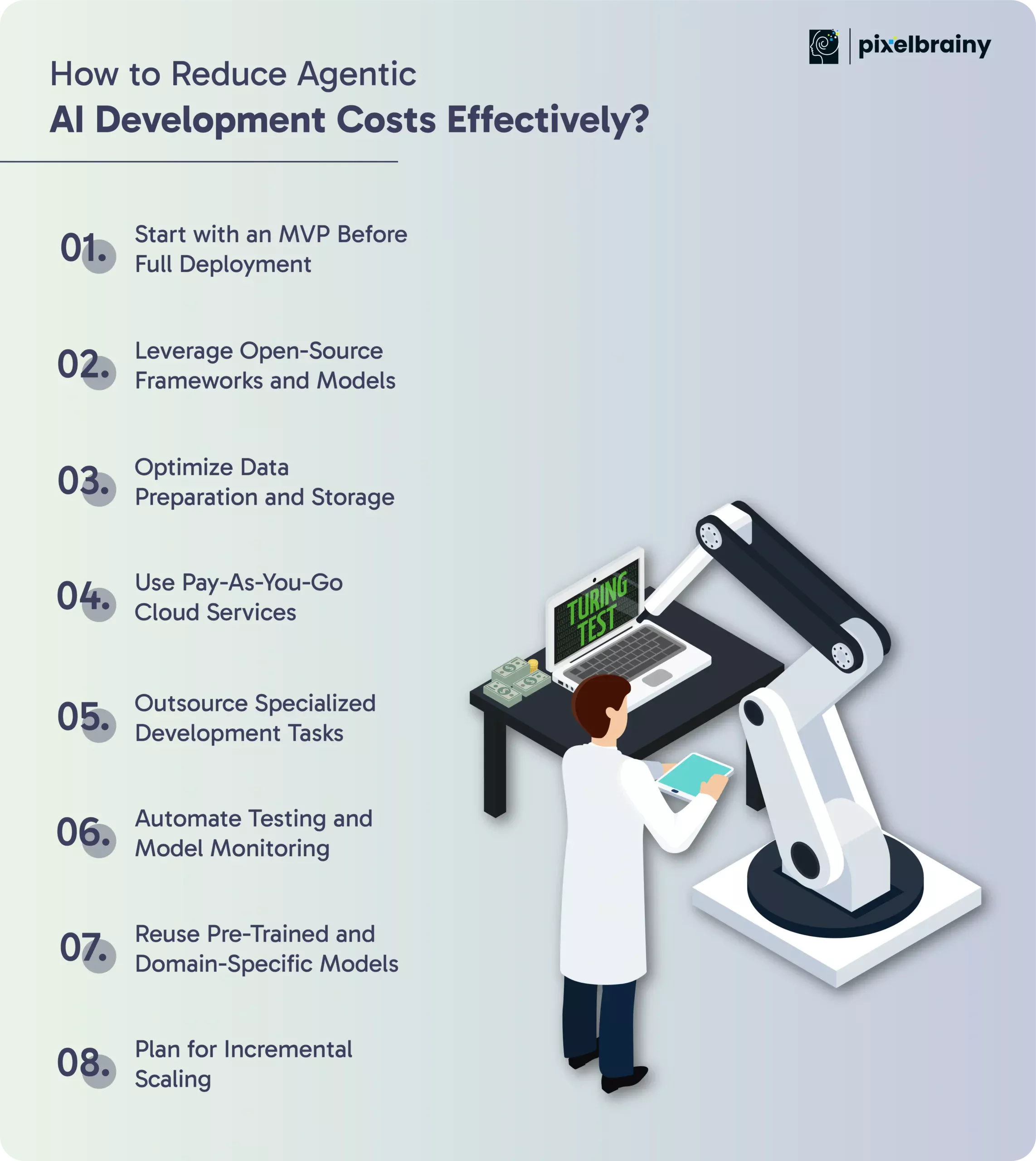 As a leading Agentic AI Development Company, PixelBrainy helps businesses develop Agentic AI on a budget without compromising innovation or scalability. Our approach focuses on strategic planning, modular design, and efficient resource use to keep costs transparent and manageable from the very first stage. By adopting an MVP-first strategy and leveraging open-source frameworks, we help organizations minimize upfront Agentic AI project cost and scale intelligently as value is proven.