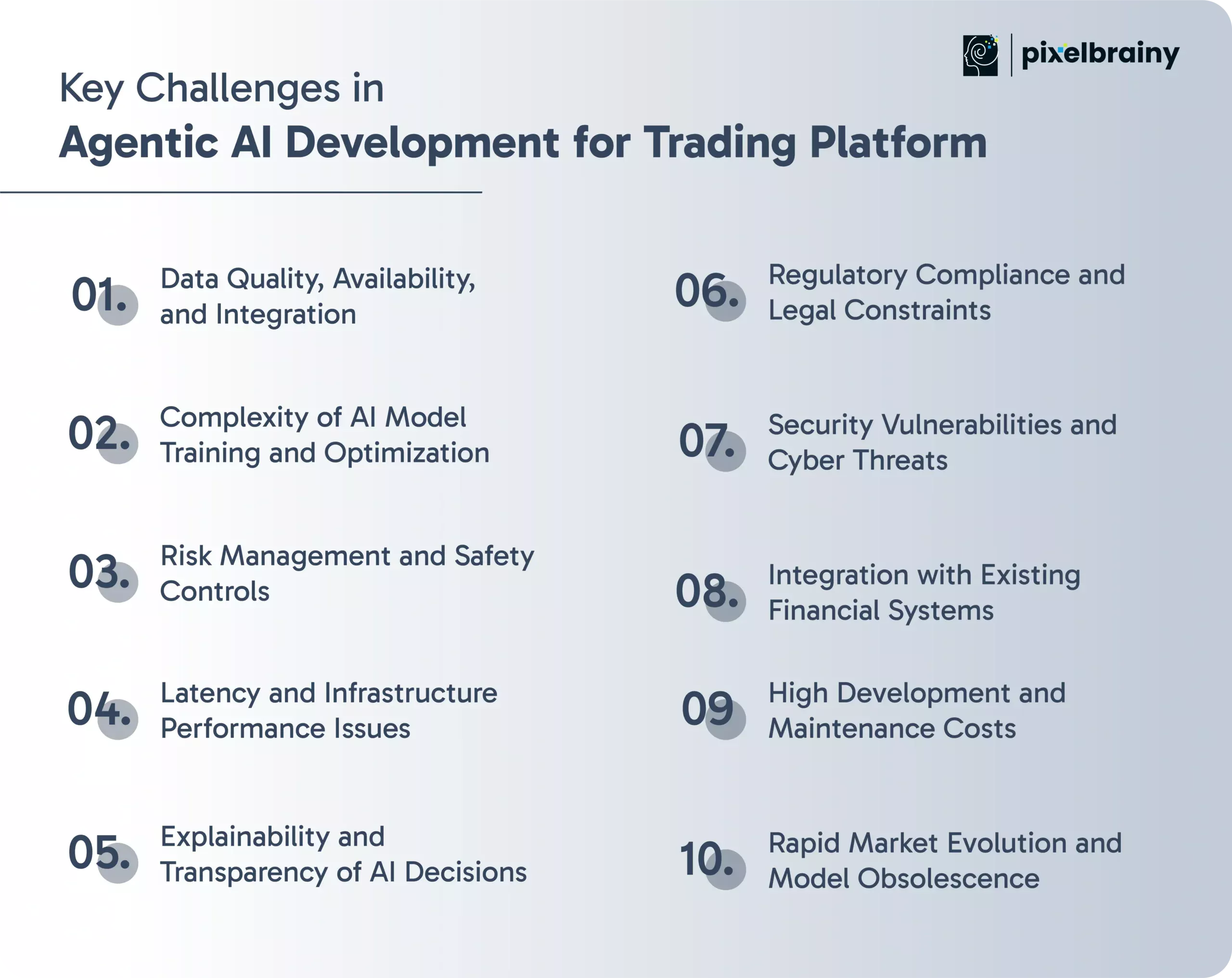 Creating a high-performing Agentic AI for Trading Platform is an exciting opportunity, but it’s far from simple. Teams often face hurdles like managing complex data, ensuring system security, and meeting strict regulatory standards, and tackling these challenges early is essential for building a stable, profitable, and scalable trading solution.