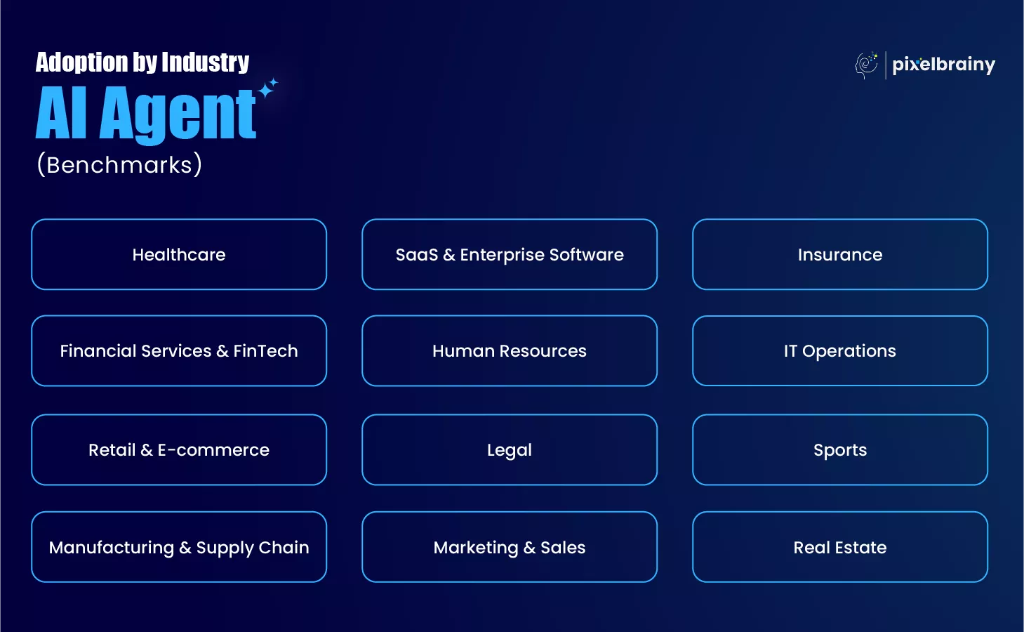 IT operations, healthcare administration, financial services, SaaS, and insurance are leading AI agent adoption due to clear ROI and repeatable workflows.