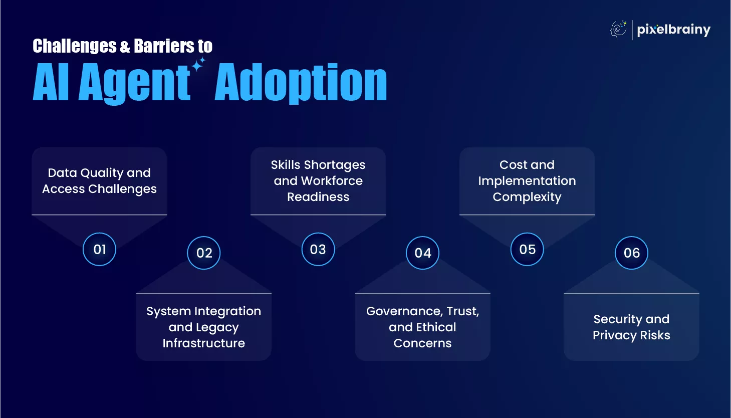 While AI agents are rapidly advancing from pilots to production use, many organizations still face significant obstacles that slow or prevent full adoption. These challenges are both technical and organizational, and they reflect how real-world AI agent deployments interact with existing systems, people, and governance requirements.