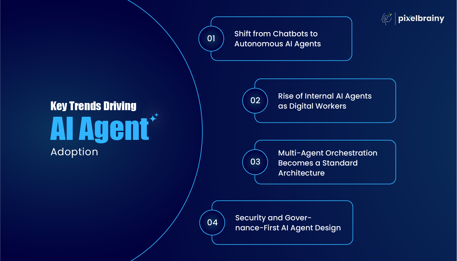 From this above key trends driving AI agent adoption show that organizations are shifting from chatbots to autonomous AI agents, embedding them as internal digital workers, orchestrating multiple agents, integrating them with enterprise systems, and prioritizing security and governance to scale AI agents responsibly.