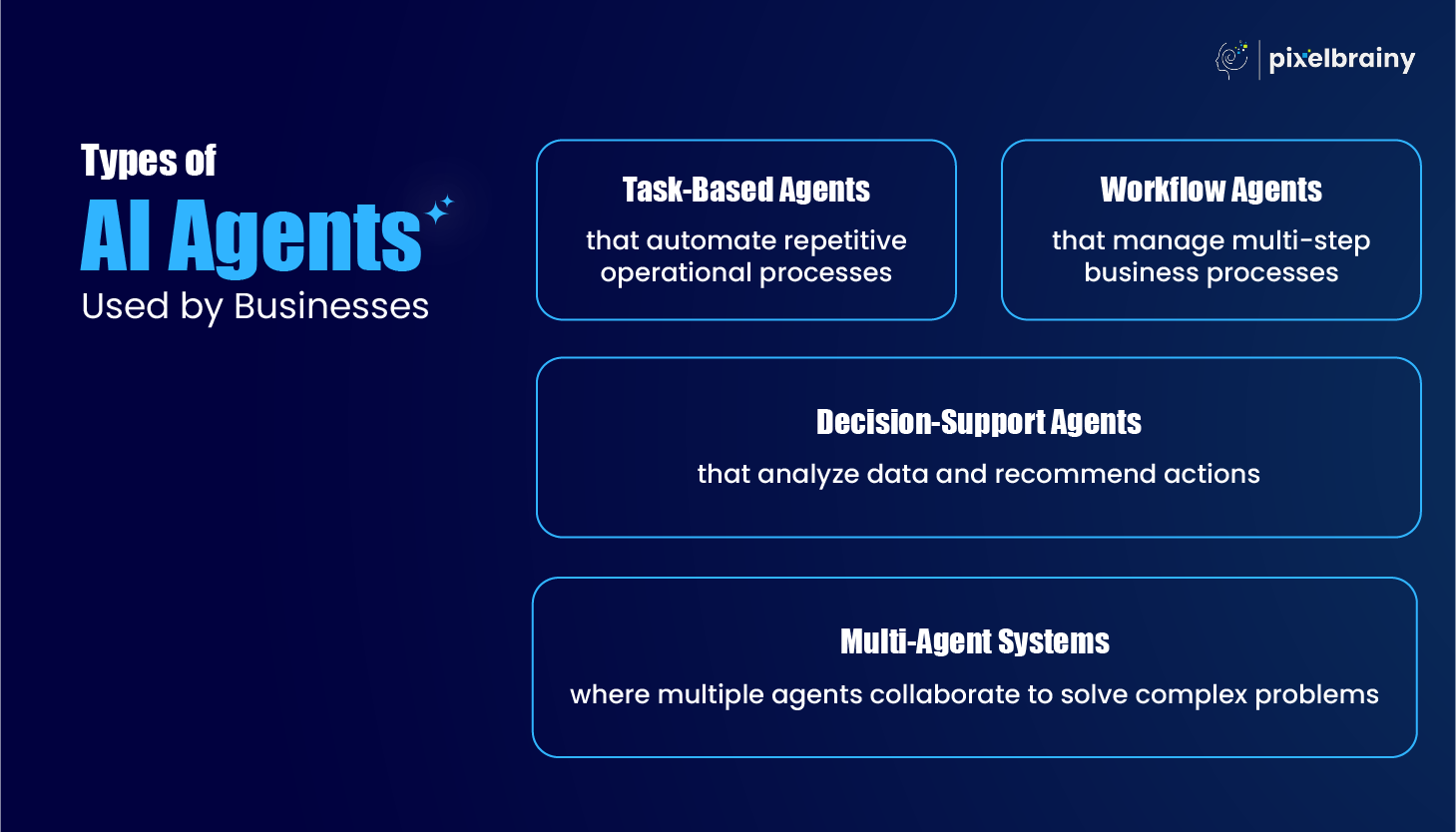 Organizations deploy different categories of AI agents depending on their maturity and objectives:
