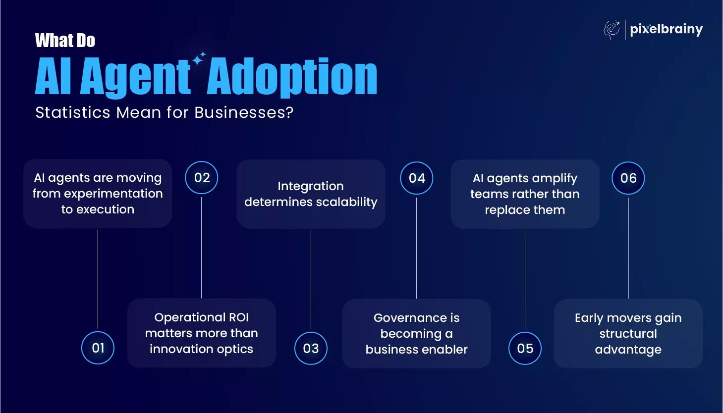 AI agent market statistics show that many organizations struggle to scale beyond pilots due to integration, governance, and unclear ROI. PixelBrainy addresses these gaps by treating AI agents as operational infrastructure, not experimental tools.