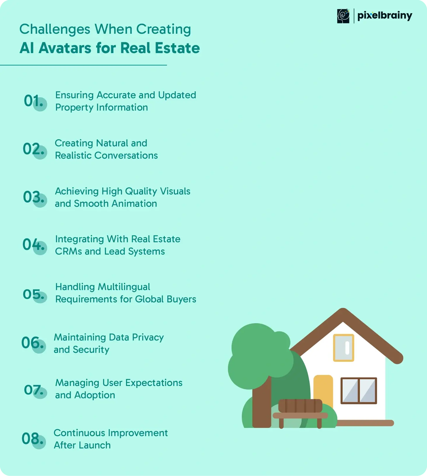 Building an AI avatar for real estate can significantly enhance digital engagement, but the development process comes with its own set of challenges. Real estate businesses must understand these obstacles to ensure the avatar performs reliably, communicates accurately and truly supports the buyer journey. Below are the most common challenges along with practical ways to overcome them.