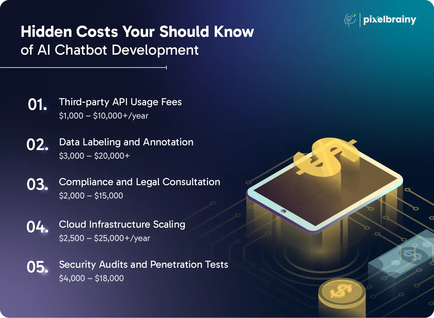 Hidden costs include data labeling and annotation expenses, third-party API fees, integration complexities, and ongoing maintenance. Additionally, costs may be relevant to training staff to reap the rewards of the new system and updating existing infrastructure to support the chatbot’s functionality.