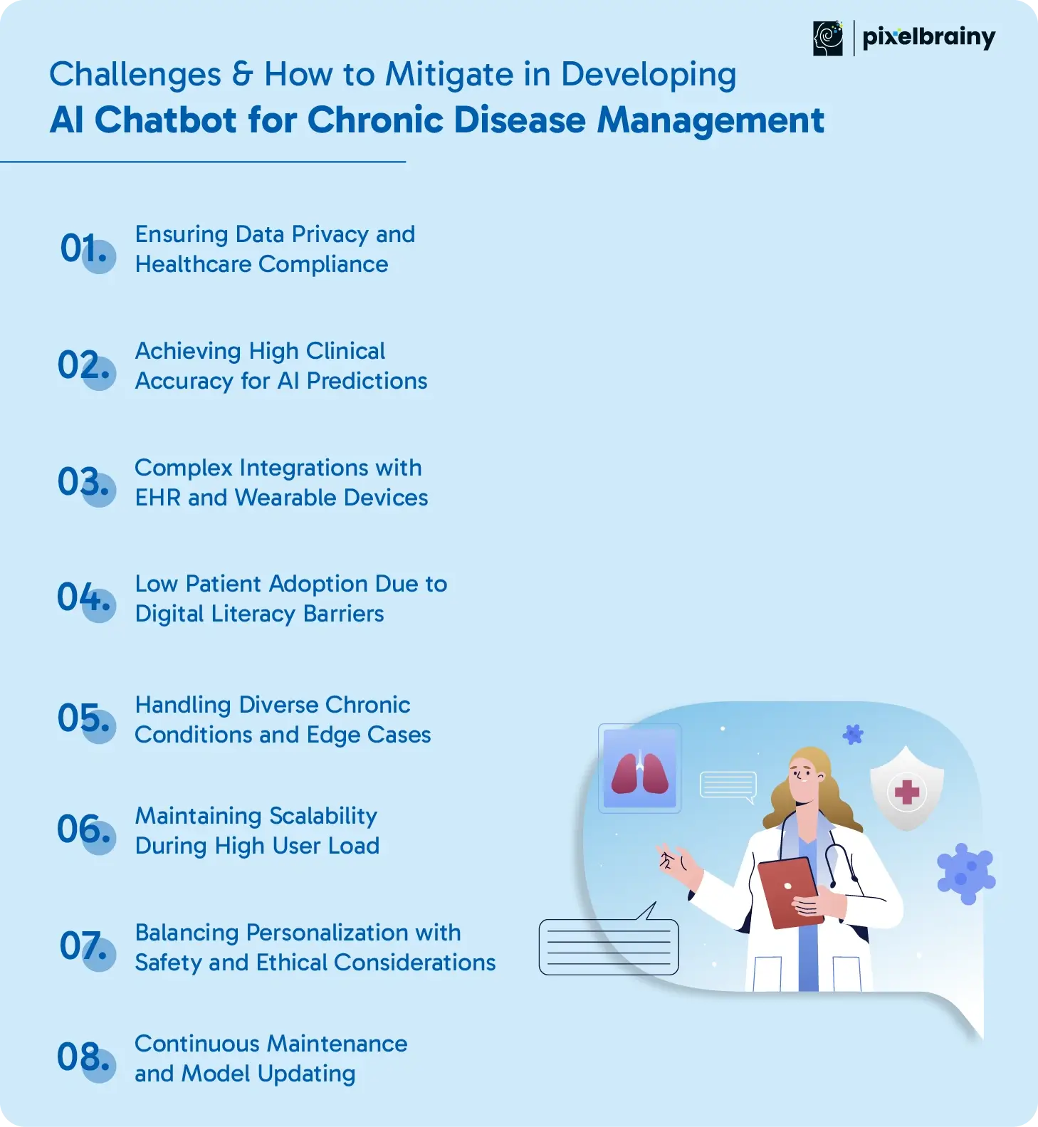 Below are the most critical challenges that teams face during Chronic Disease Management chatbot development, along with proven mitigation strategies that ensure safety, accuracy and long term success.