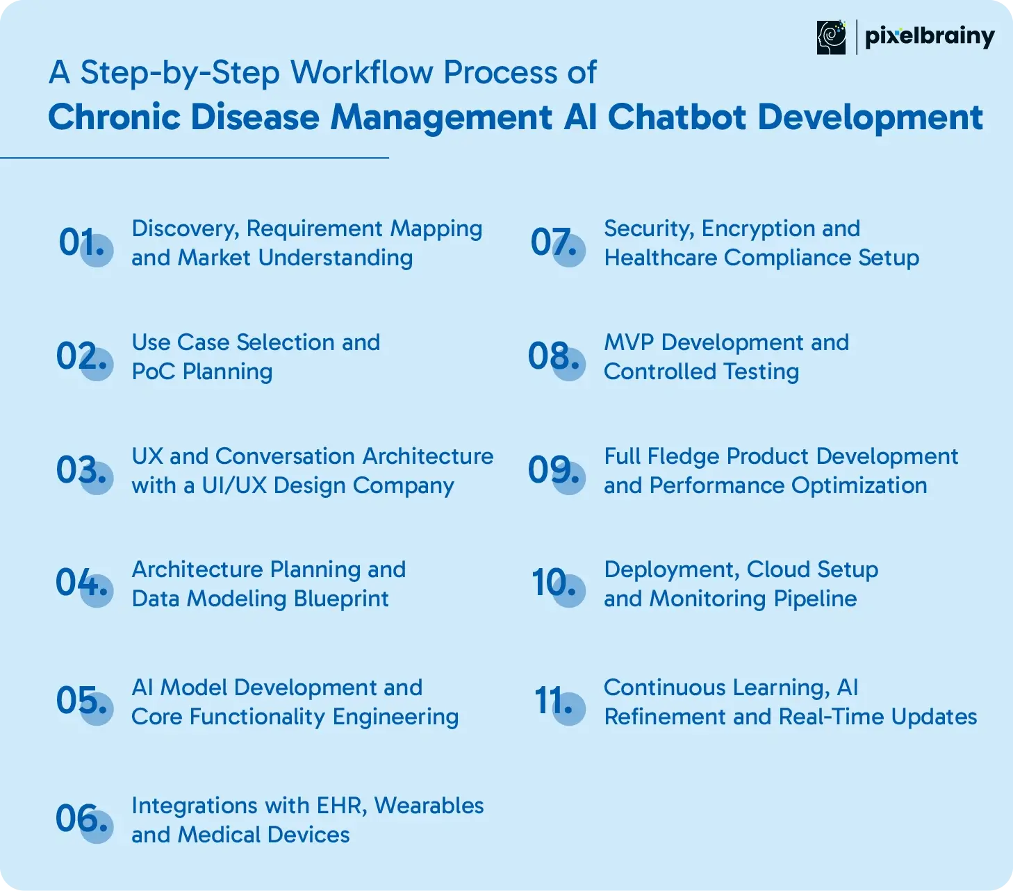 The Chronic Disease Management AI Chatbot Development workflow requires a structured plan that ensures clinical accuracy, seamless patient experience and compliance with healthcare standards.