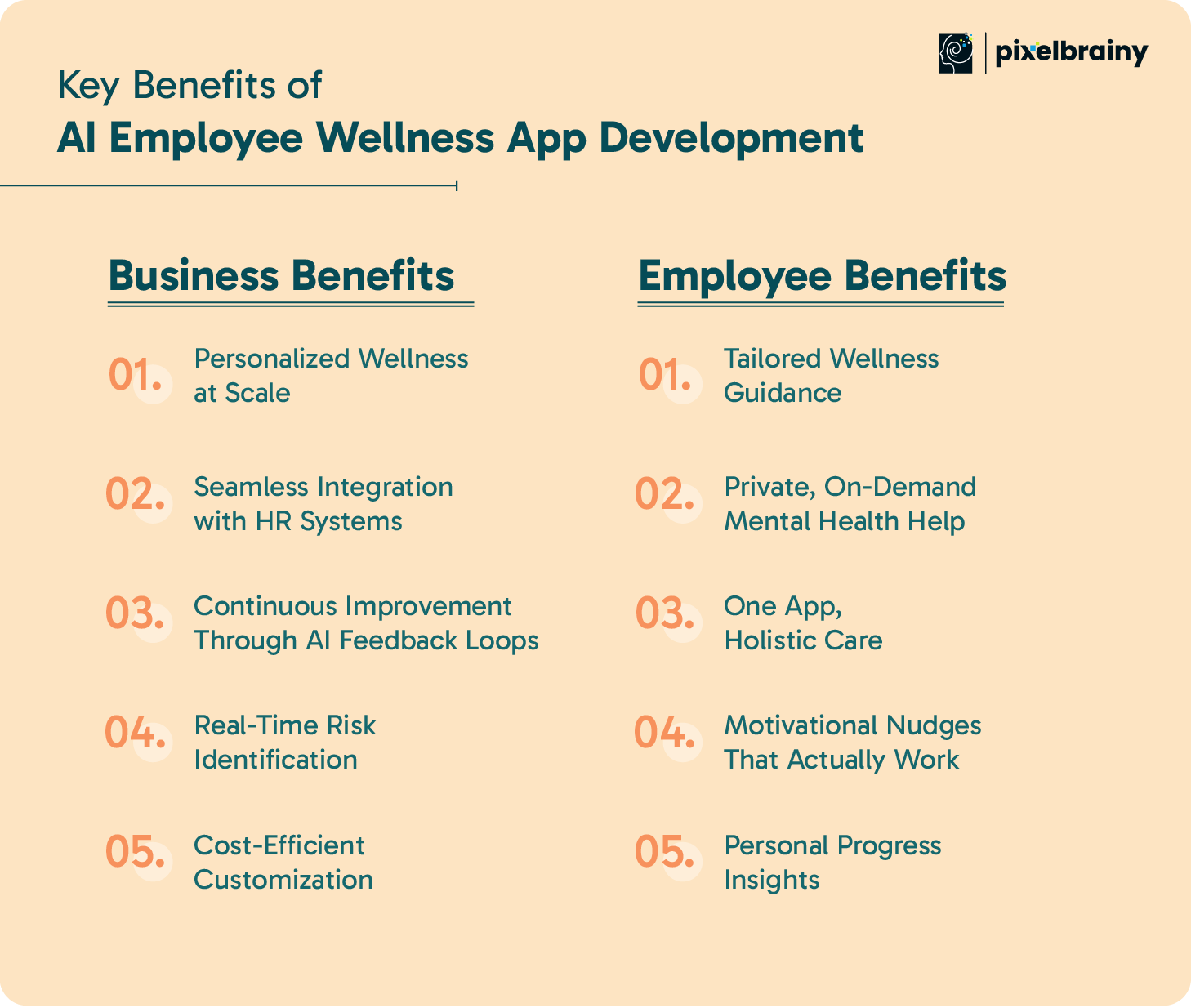 Below, we will discuss the benefits of AI for employee wellbeing and businesses looking to build an app.