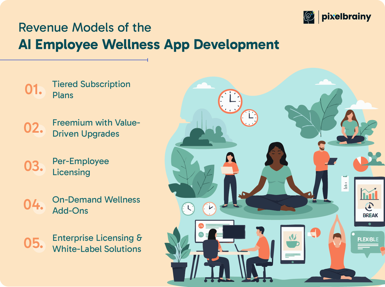 Below are the top five proven and scalable monetization strategies for custom AI employee wellness app development: