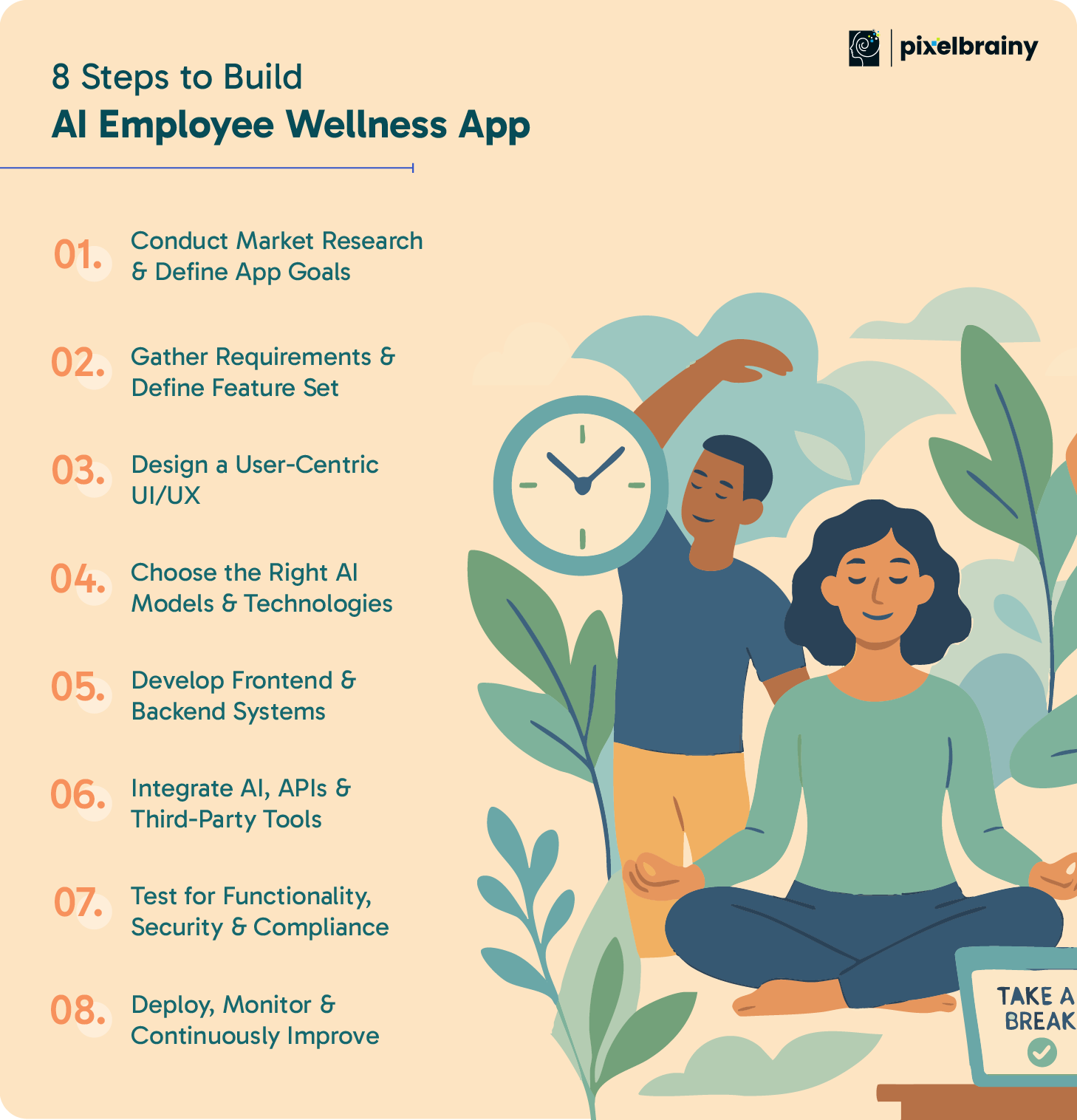 Are you planning to develop AI employee wellness app in 2025? Below are eight essential steps to guide HR leaders, product teams, and decision-makers through the app development process. This roadmap integrates technical clarity with strategic thinking to help you emerge with a successful AI employee wellness app development.