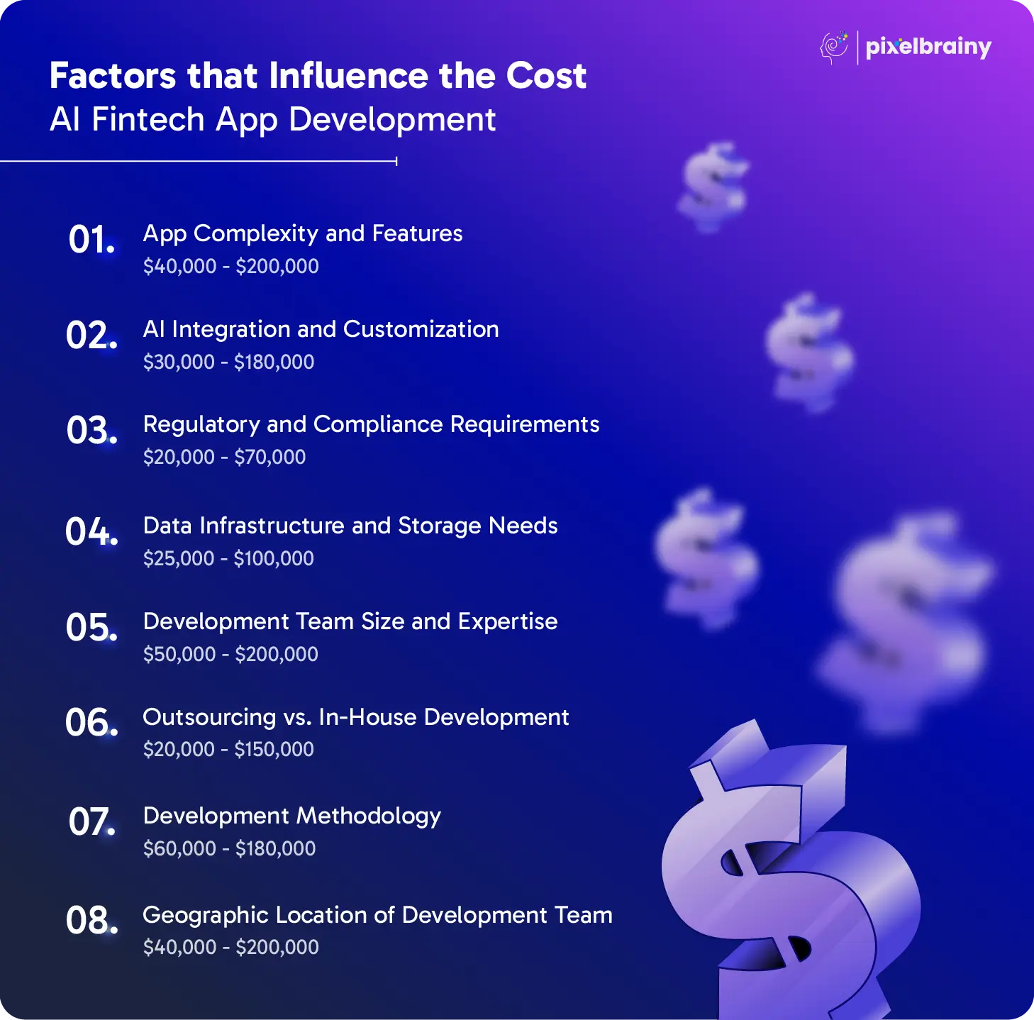 The average cost to develop AI fintech app ranges from $20,000 to $200,000+, depending on the complexity, features, and customization of the app.