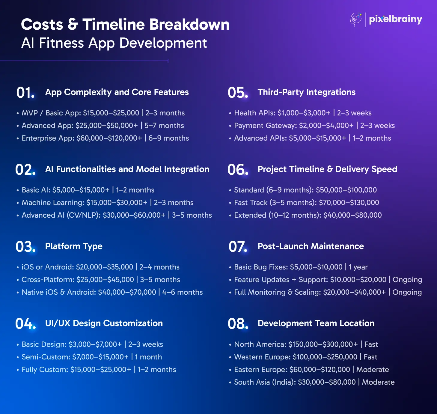Please note: This figure serves as a general reference and is not an official quotation from PixelBrainy. Every AI fitness software development project is unique, and we provide tailored cost estimates after carefully analyzing each client's specific goals, requirements, and technical requirements.