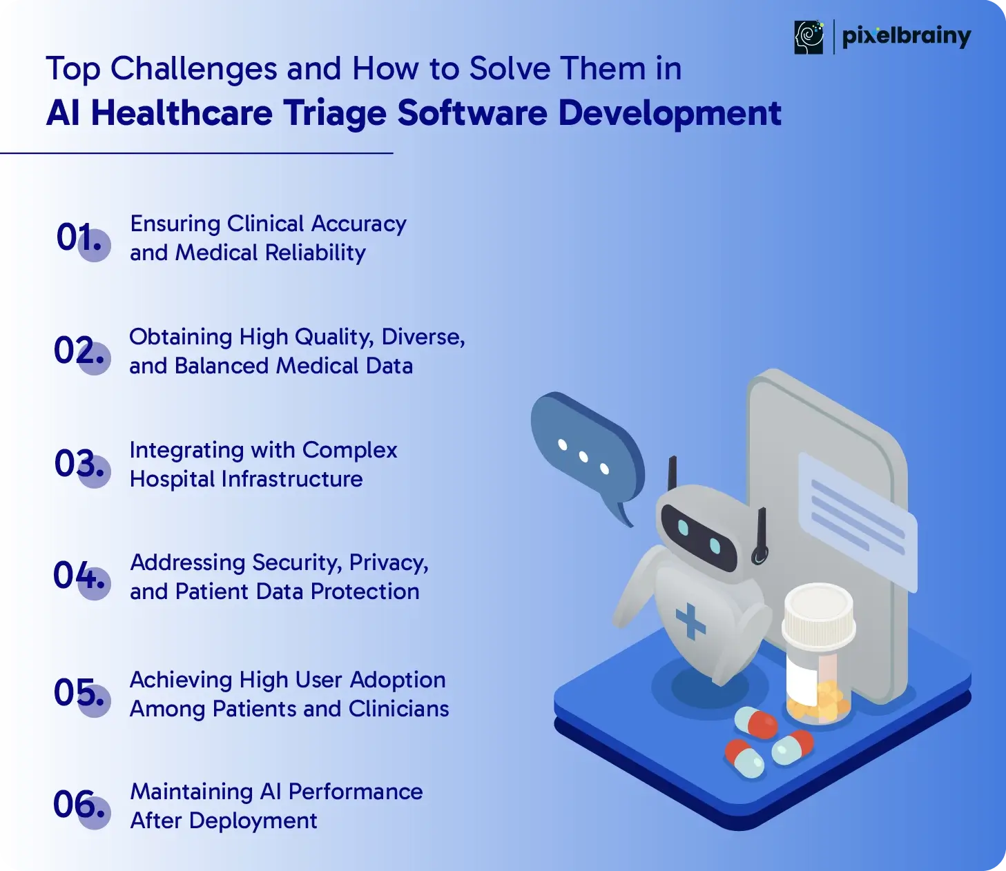 Below are the major obstacles and the practical solutions that ensure safe, accurate, and scalable triage software.