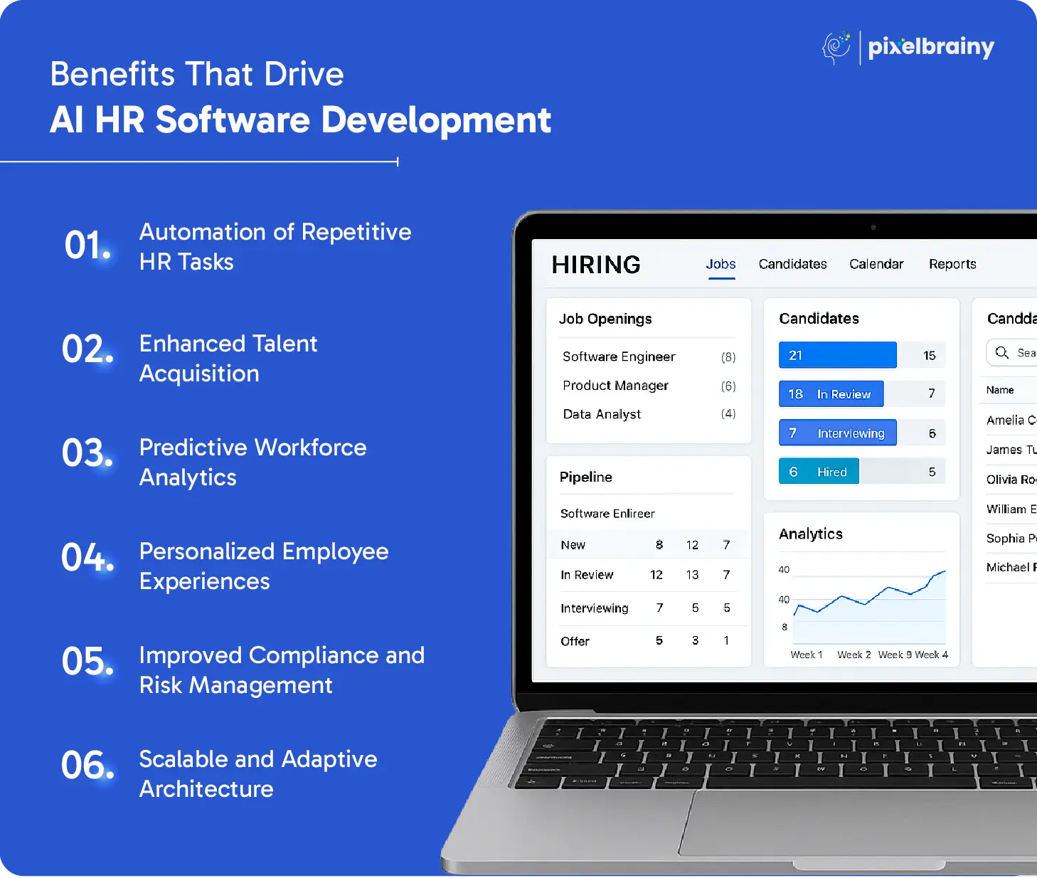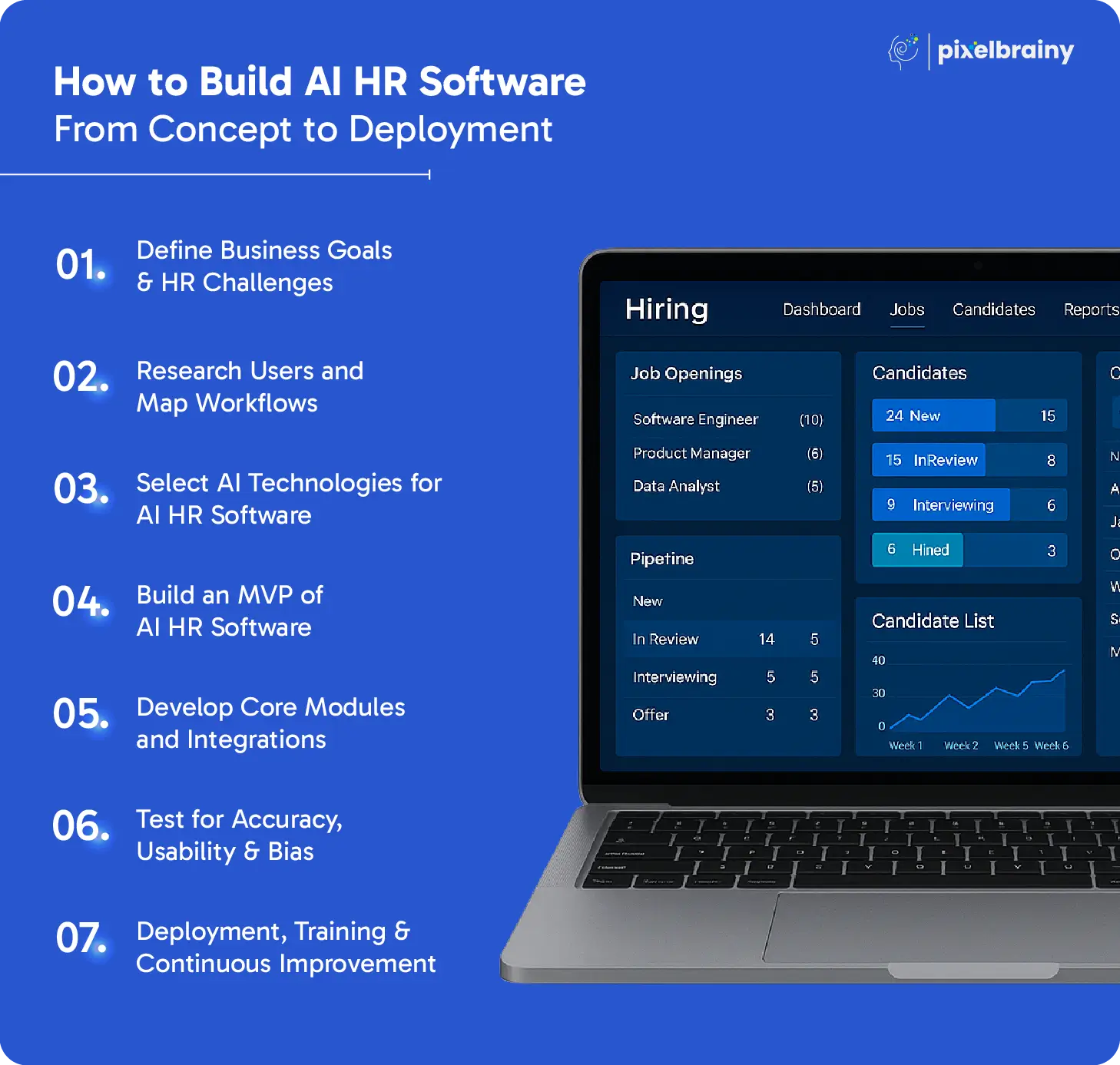 Choosing an experienced AI development company in the USA like PixelBrainy, means you’re not just building software—you’re creating a competitive advantage. From MVP to scalable enterprise platforms, we deliver tailored AI HR Software Development Solutions that adapt, learn, and evolve with your workforce.