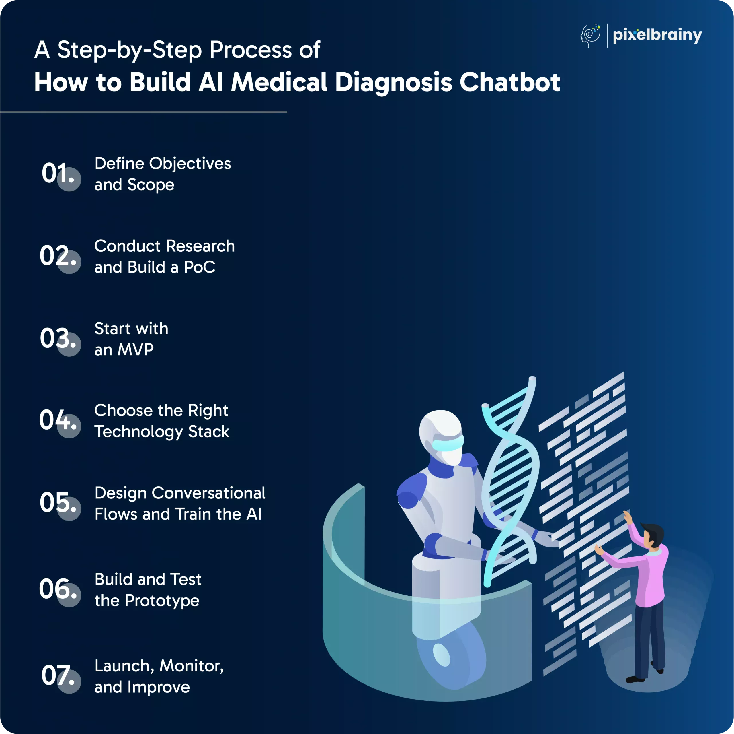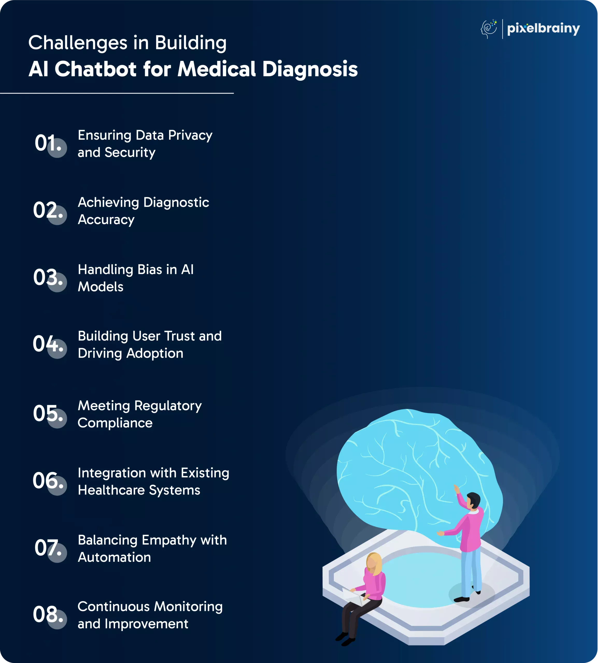 Choosing PixelBrainy means partnering with a team that understands the challenges of healthcare, masters the technology, and is committed to delivering innovative AI chatbots that redefine medical diagnosis and patient care.