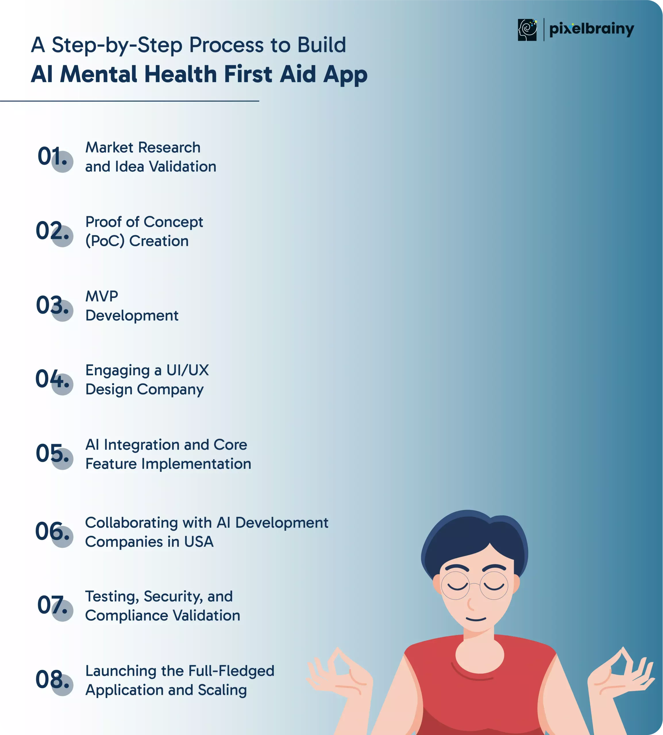 So, what is the process to create AI Mental Health First Aid App that is both user-friendly and clinically effective? The journey involves strategic planning, design, testing, and scaling. Below is a roadmap that highlights every critical step in the development of AI Mental Health First Aid App, from ideation to deployment.