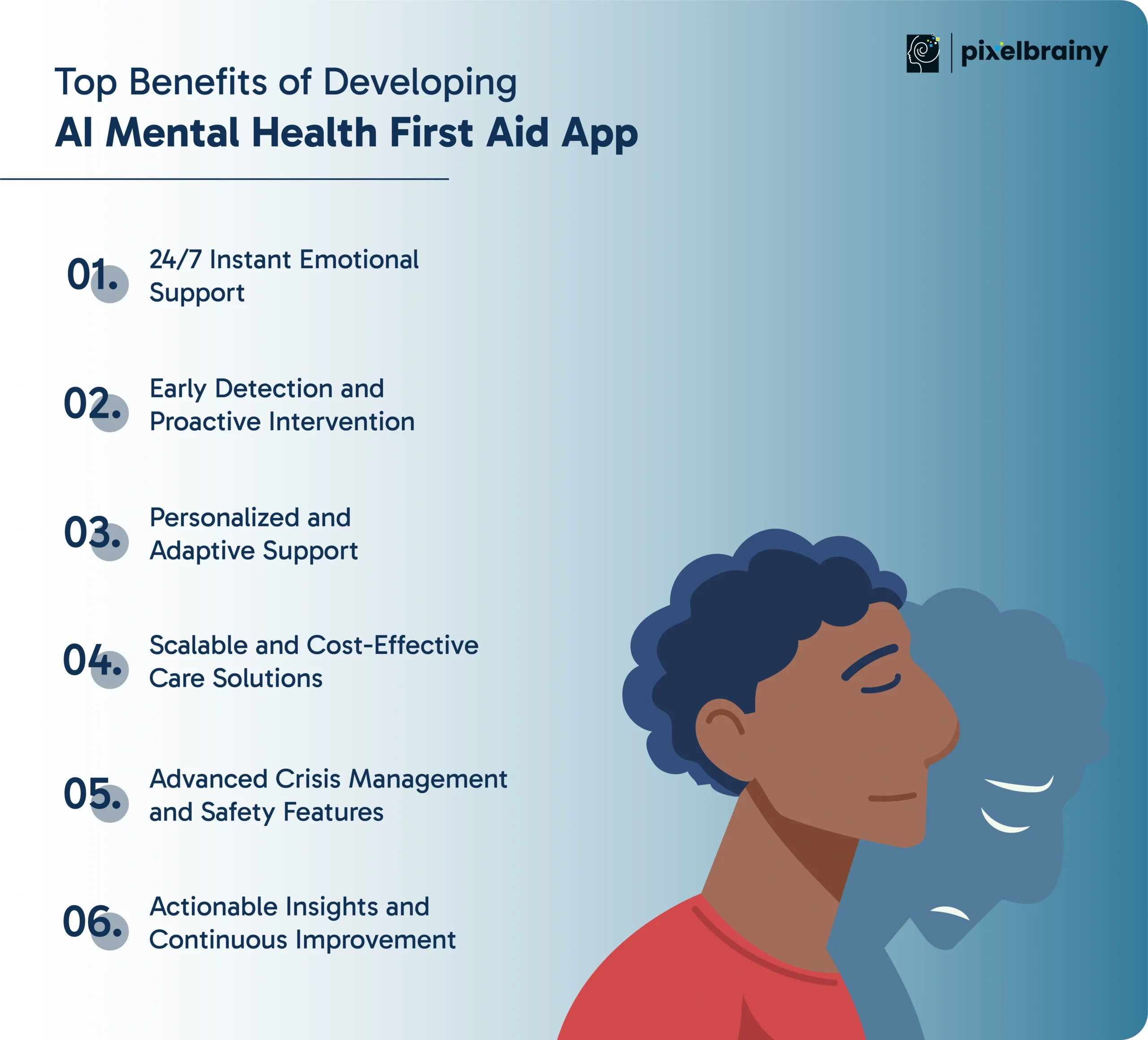 Below are the six most impactful benefits of creating an AI mental health first aid app and why it can be a game-changer for both users and organizations: