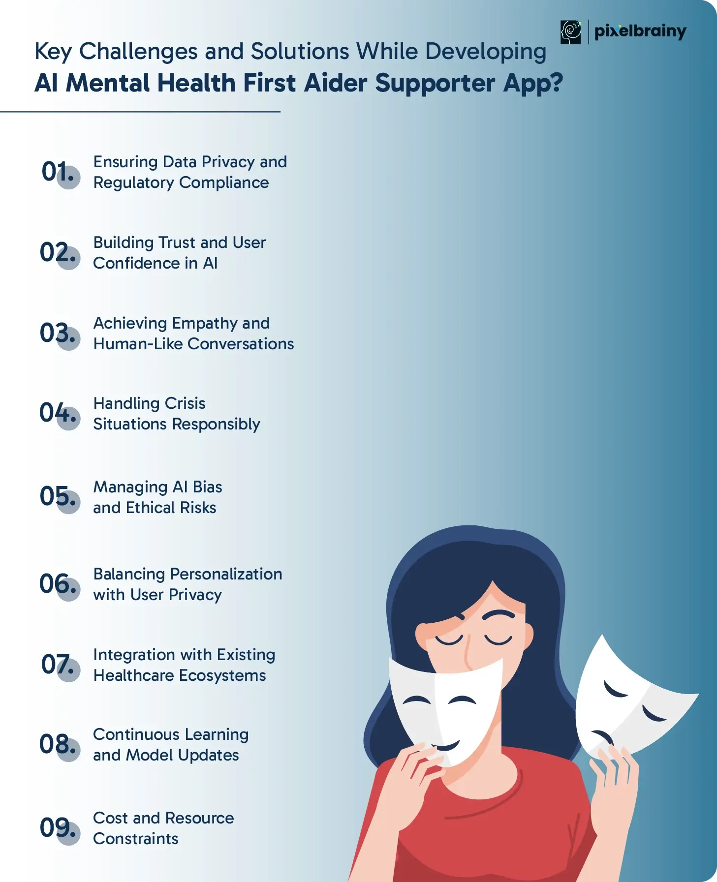 Developing an AI Mental Health First Aider Supporter App is an impactful yet complex process. While the potential of such a platform is enormous, the development journey involves several critical challenges that go beyond typical app-building tasks. These challenges stem from the sensitive nature of mental health, strict compliance requirements, evolving AI technology, and the necessity to balance innovation with empathy.