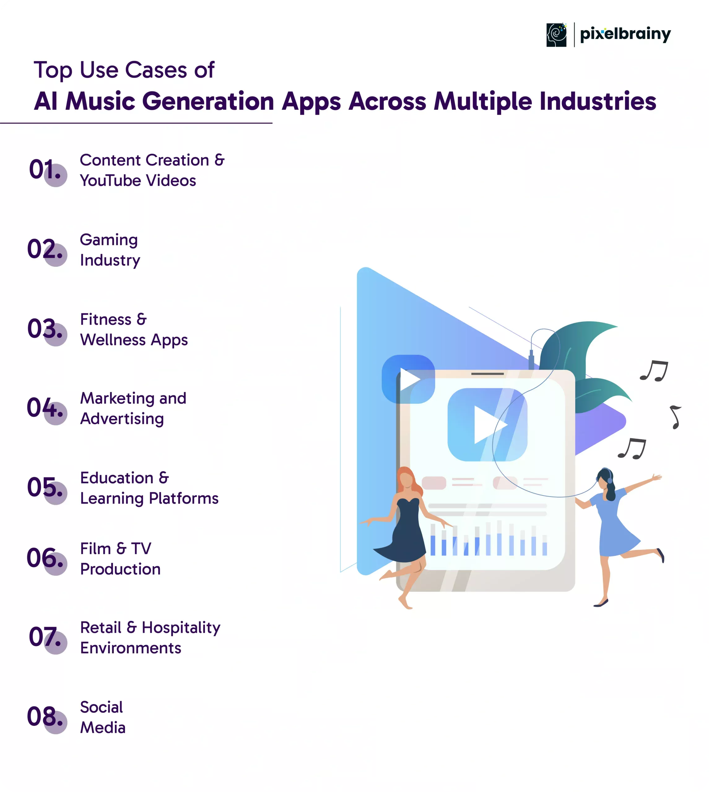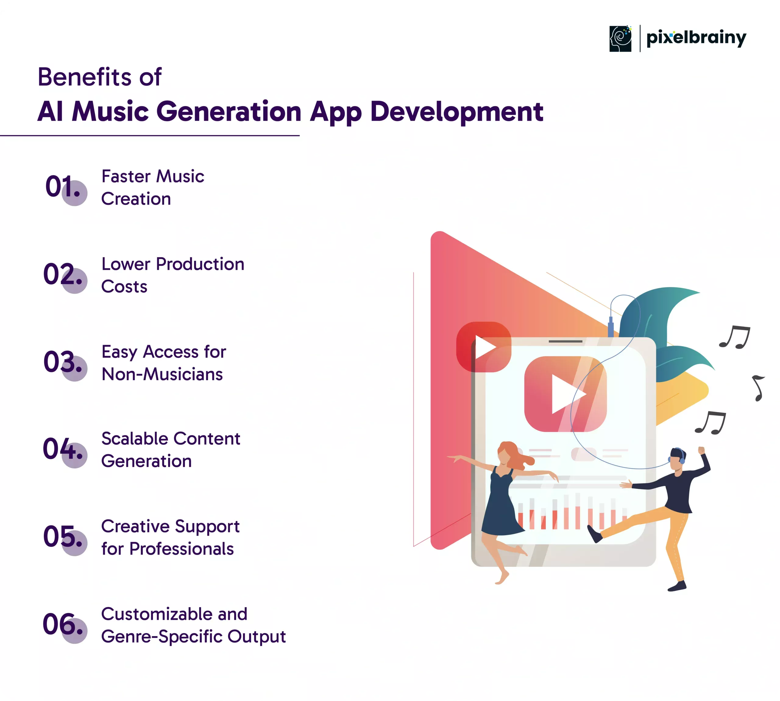 Here are the top benefits of AI music generation application development for distinct audience segments.