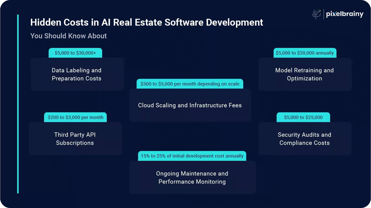 AI real estate platforms often exceed expected budgets due to poor planning, feature overload, or inefficient technology choices. PixelBrainy addresses these challenges by aligning business goals with practical development strategies that optimize real estate AI software development cost without compromising performance.