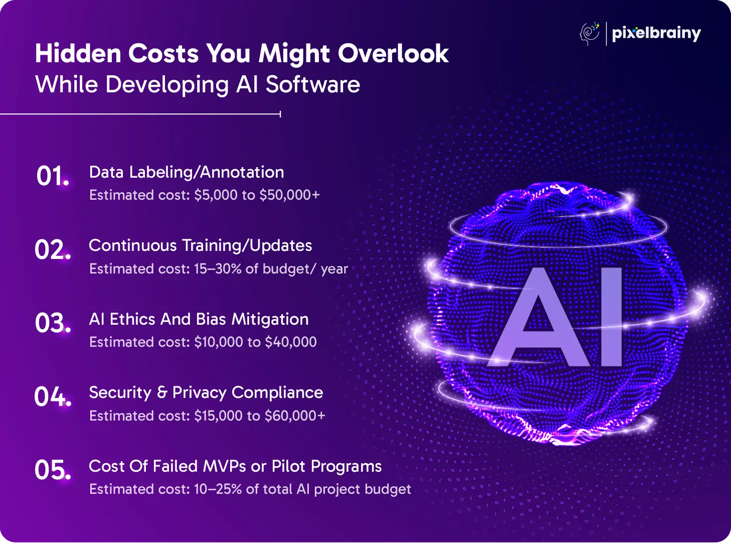 Hidden costs include data labeling, continuous training, compliance efforts, and failed MVP iterations. These can add 20–30% to your total budget if not planned properly.