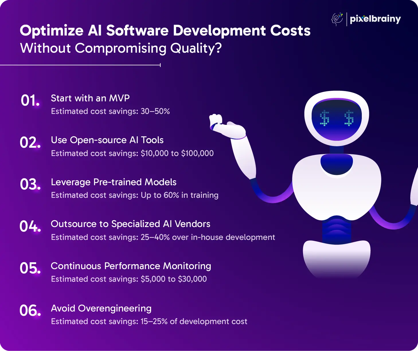 Start with an MVP, use pre-trained models, avoid overengineering, and work with experienced vendors. Smart planning and reuse of components are key.