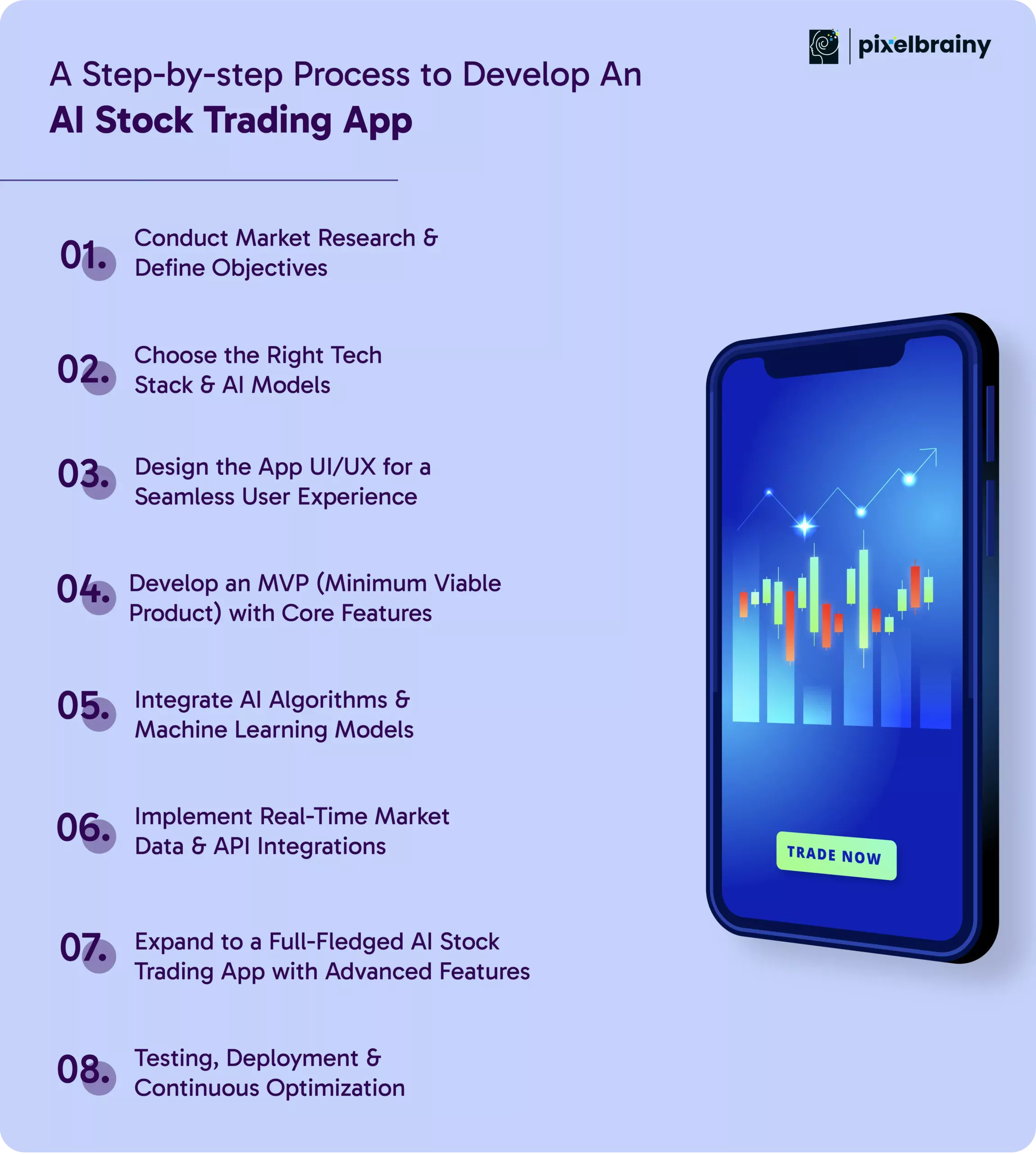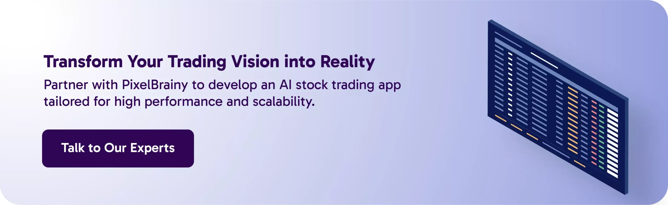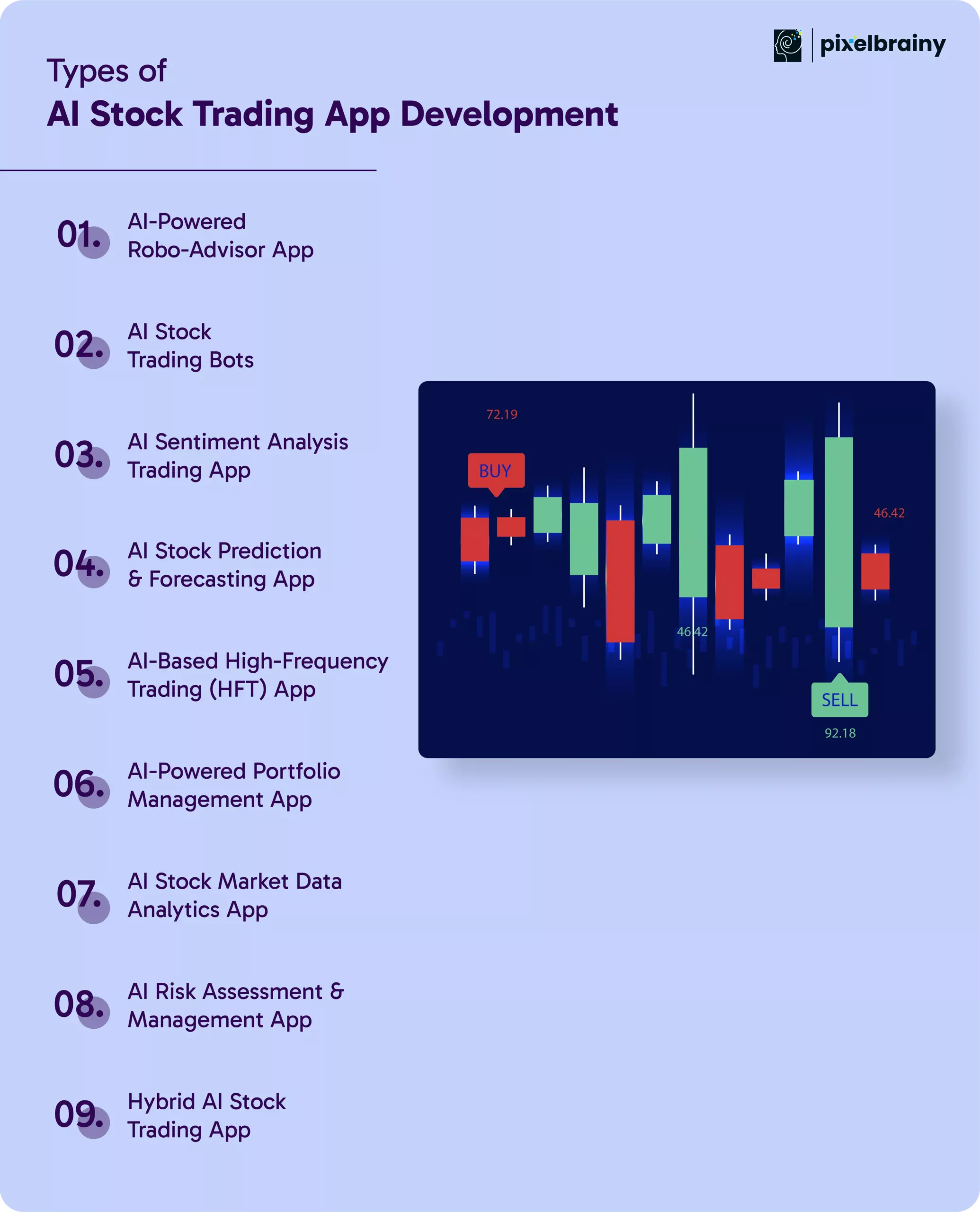 At PixelBrainy, we specialize in developing scalable, secure, and regulation-compliant AI stock trading applications tailored to unique business requirements. Our team of AI fintech experts delivers top AI models, smooth development, and ongoing support to assist you keep progressing in the fast-paced trading industry.