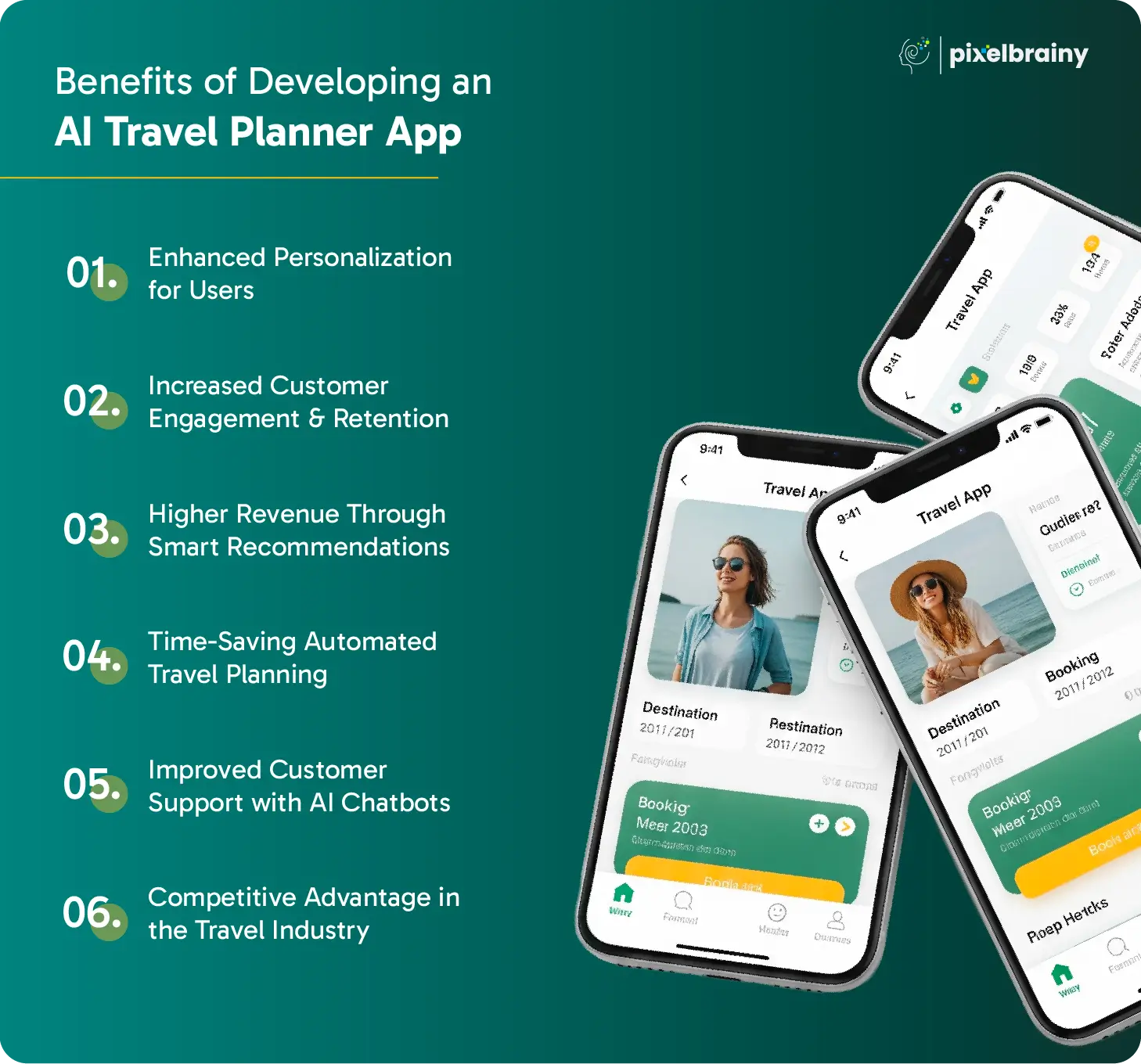 Invest in AI-powered travel planner app development to transform the way users plan and experience their trips. Thus, you can boost customer satisfaction, brand loyalty, and revenue potential.