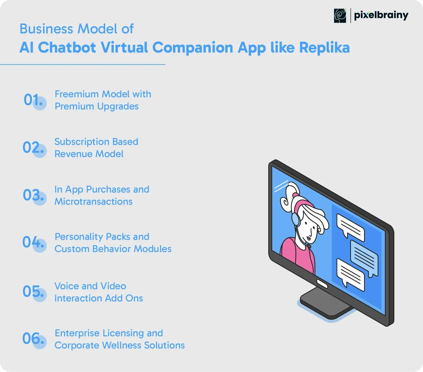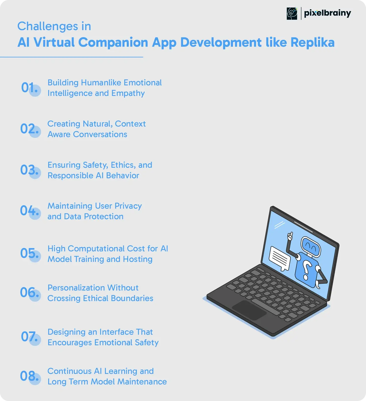 PixelBrainy is one of the most reliable partners for businesses looking to invest in AI Virtual Companion App Development like Replika. With a strong foundation in NLP, emotional AI engineering, and machine learning, the company specializes in creating intelligent systems that communicate naturally, learn continuously, and deliver personalized emotional support. As a trusted AI development company, PixelBrainy brings both technical depth and creative thinking to every project, ensuring that your vision of developing AI Chatbot Companion App Like Replika is executed with precision and innovation.