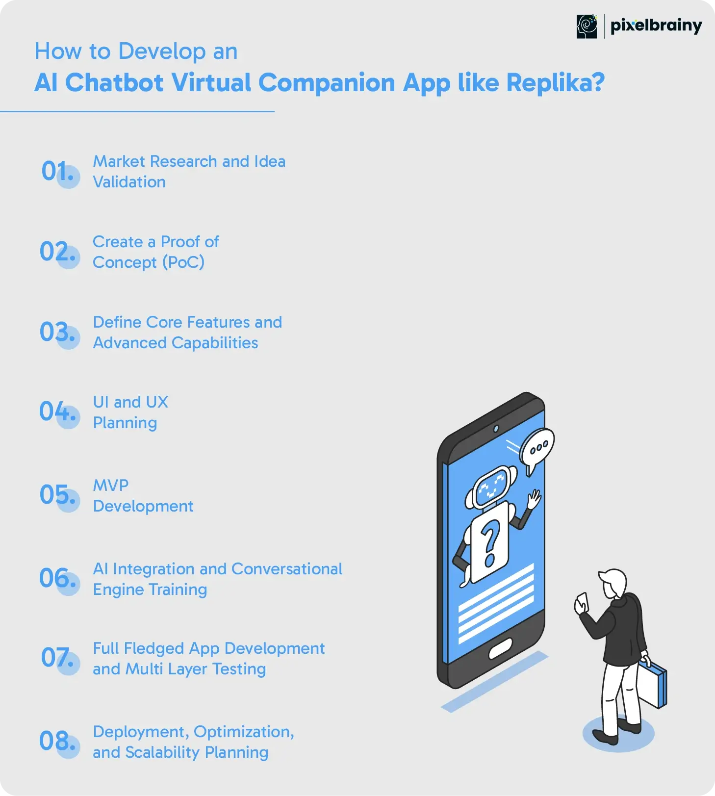 Below are eight expanded steps for Replika like Chatbot Virtual Companion App Development Integrating AI.