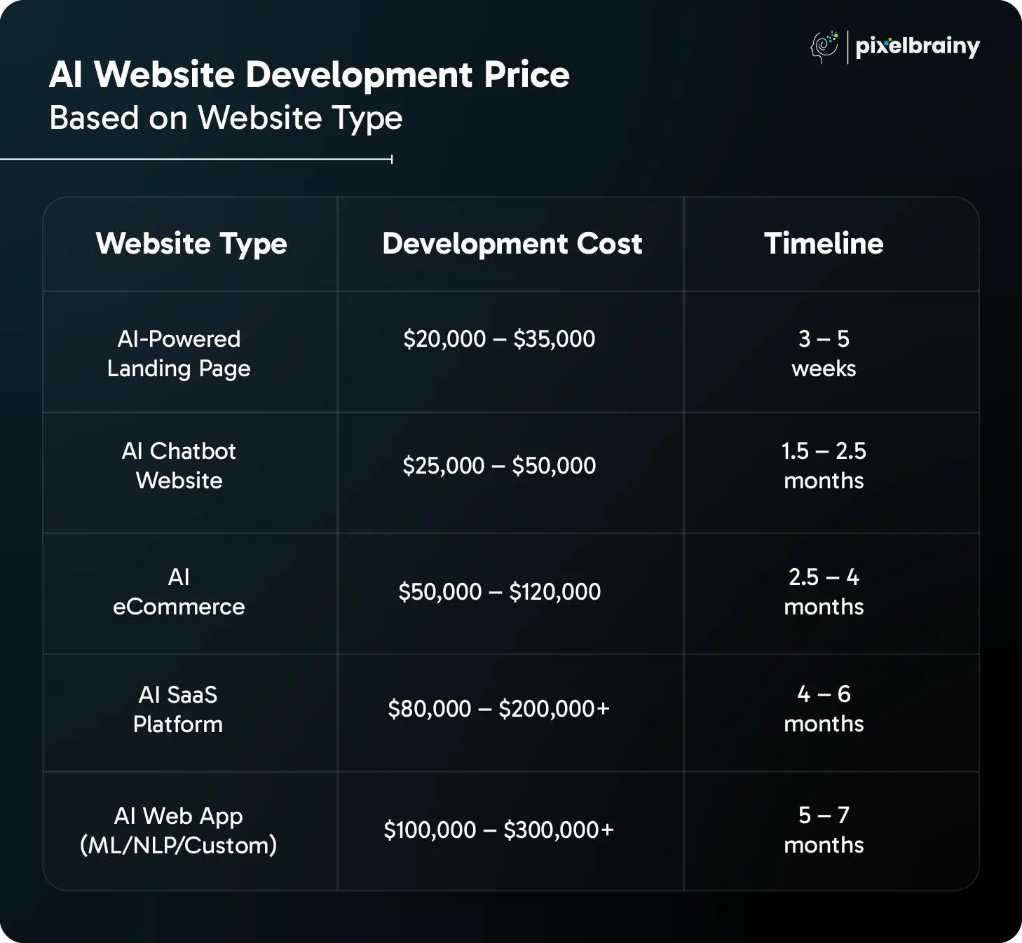 | AI Web App (ML/NLP/Custom) | Custom models, vision/NLP tools, intelligent data pipelines, real-time AI adaptation | $100,000 – $300,000+ | 5 – 7 months |