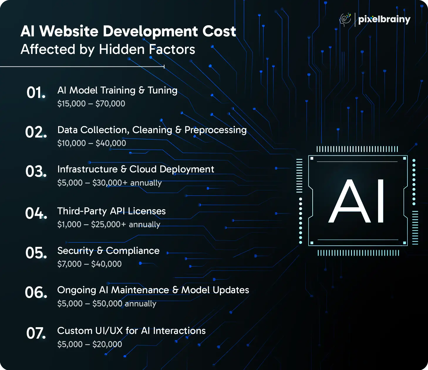 | Technology & AI Integration | API setup to custom AI model training | $10,000 – $75,000+ |