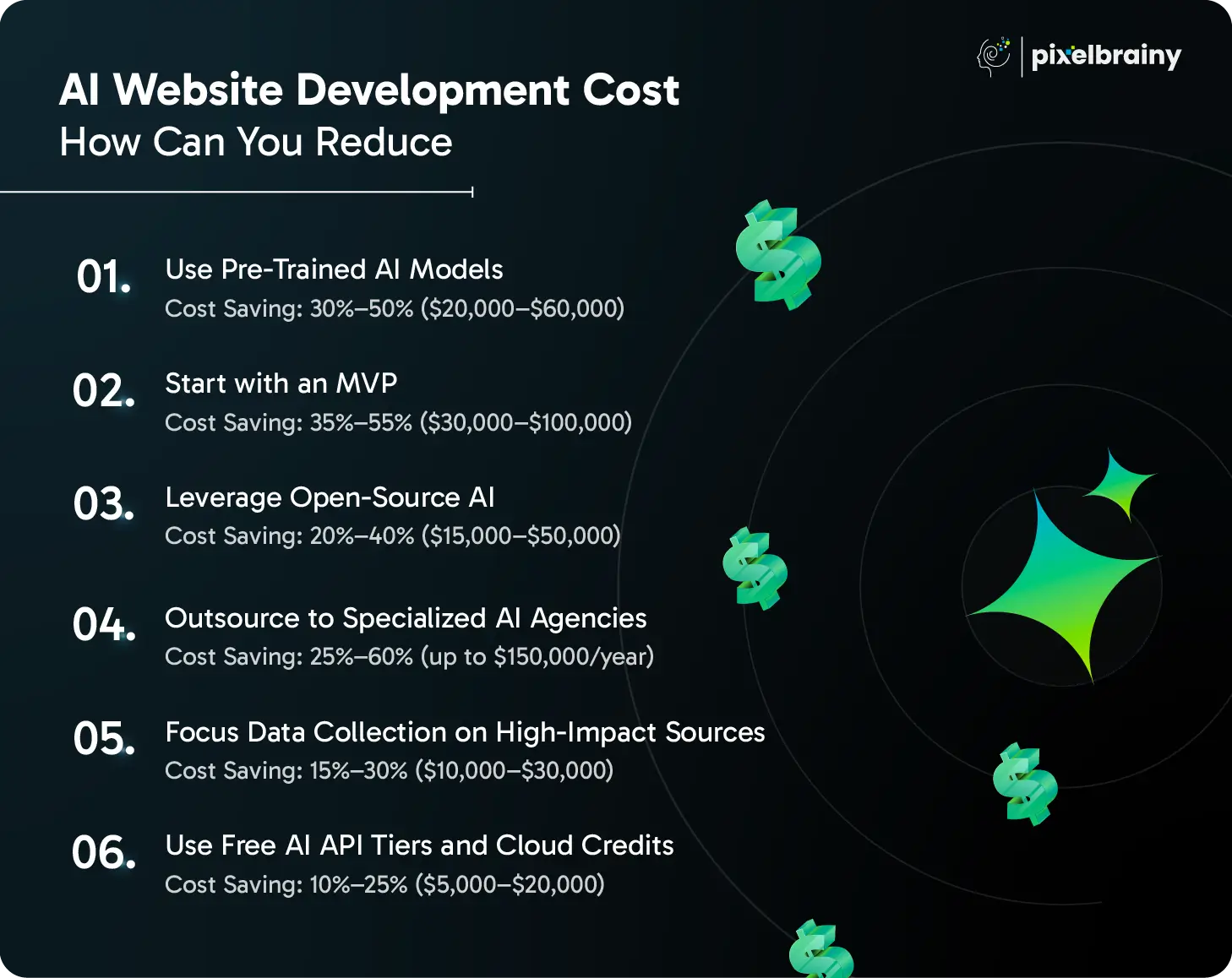Here are the most effective ways to reduce AI website development cost, supported by potential savings you can realistically expect.