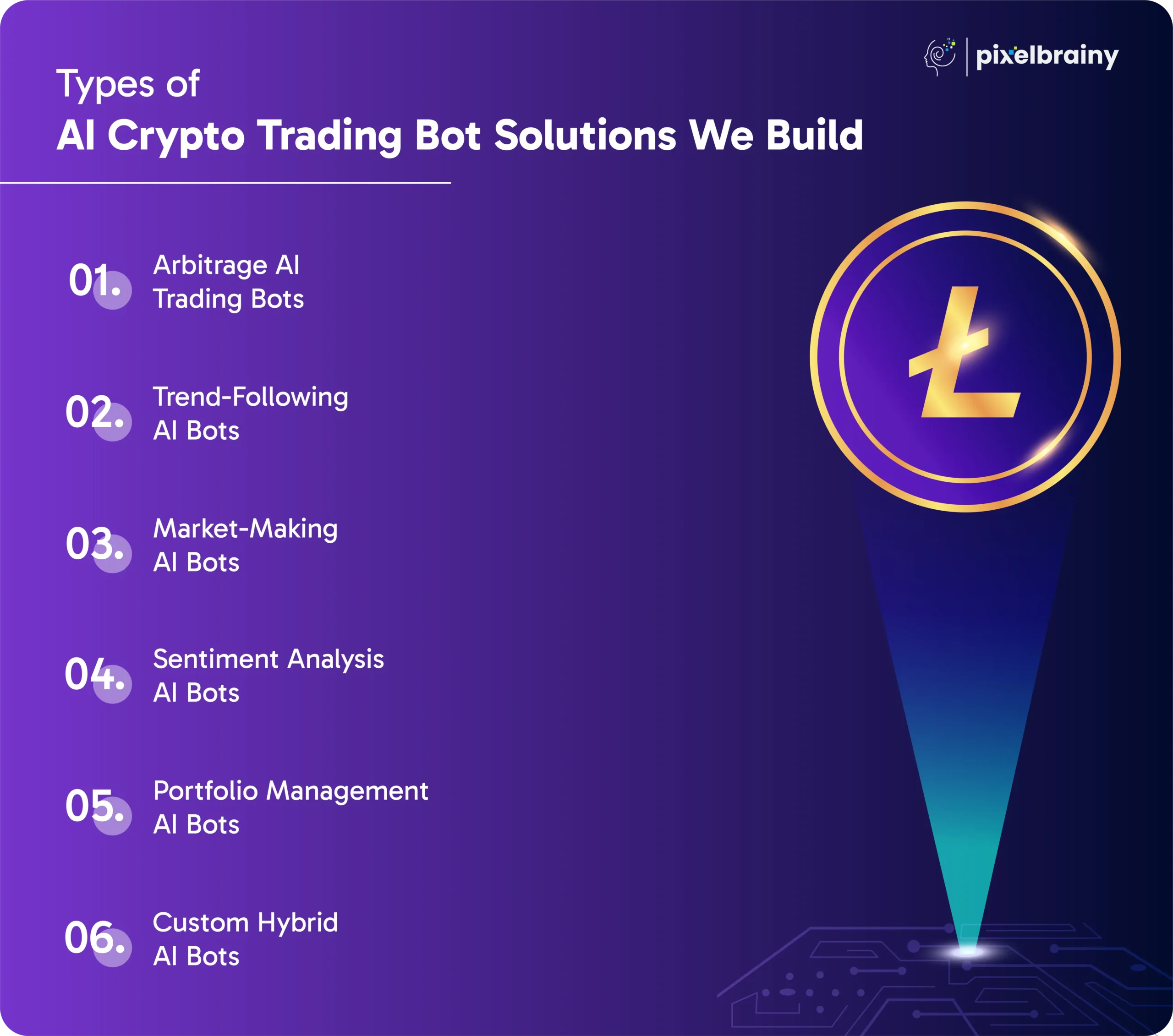 That is why when we build an AI Crypto Trading Bot, we focus on designing specialized systems that match your specific strategies, market goals, and operational needs. Our AI Crypto Trading Bot development expertise covers a wide spectrum of high-performance solutions.