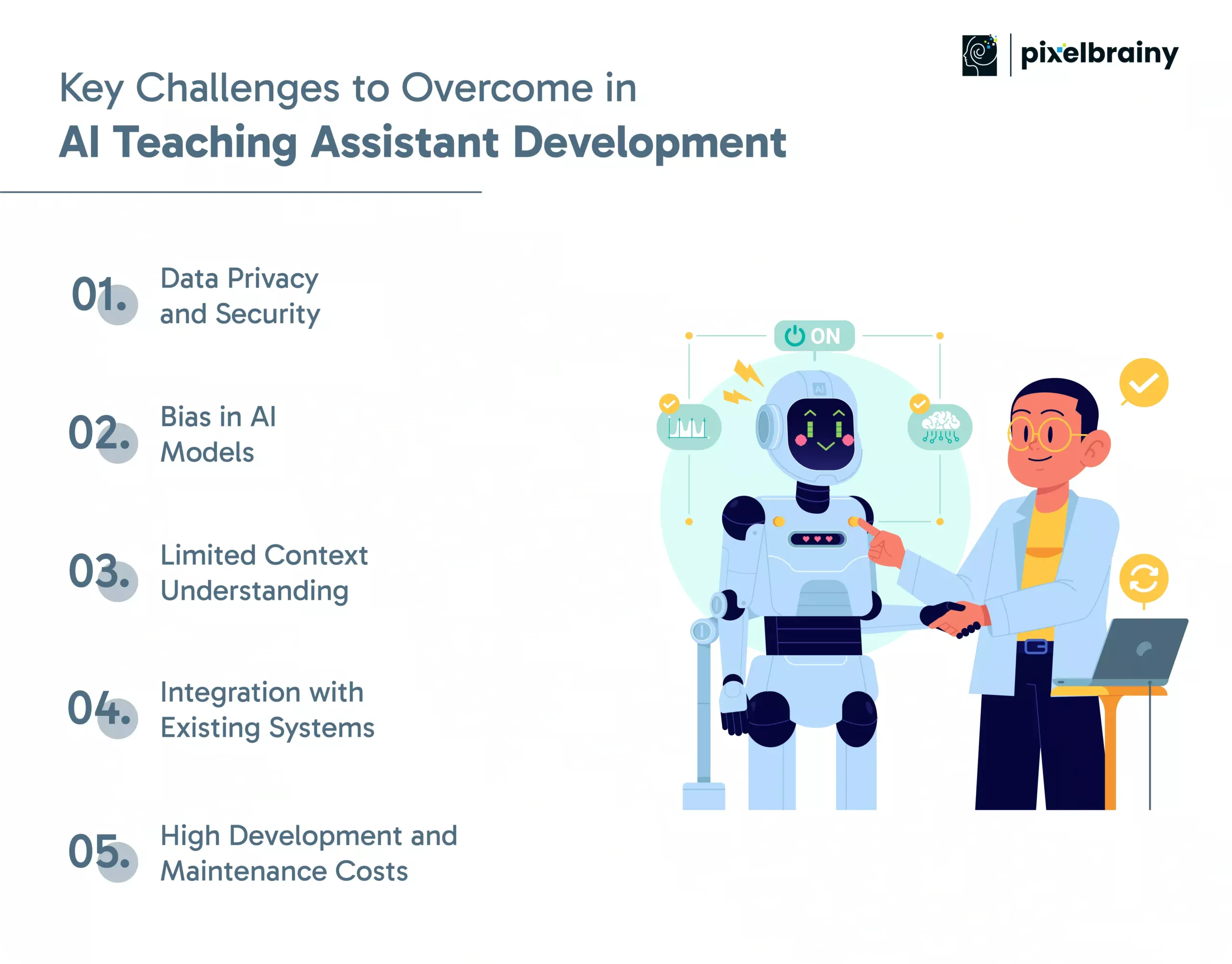 While AI teaching assistants hold the caliber to revolutionize the industry, the development team has to encounter technical, ethical, and operational challenges. You need to be skilled enough to recognize these obstacles early and find ways to confront them.