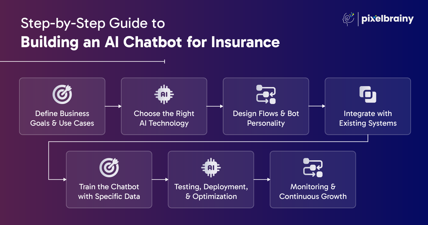 Custom AI chatbot development for insurance agencies demands strategic planning, domain knowledge, and the right technology. Below is a step-by-step guide to help insurance agencies make a chatbot that delivers real value: