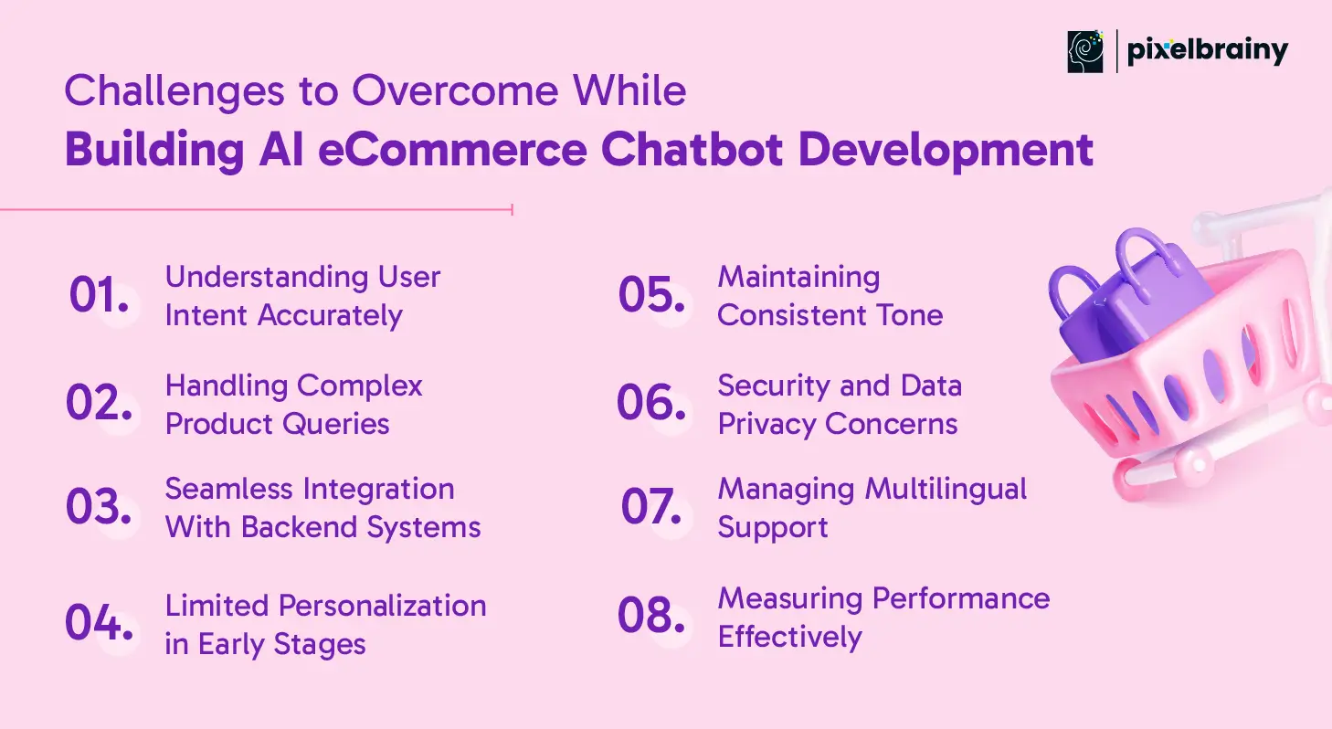 Below are some of the most common challenges in AI eCommerce chatbot development, along with ways to overcome them effectively.