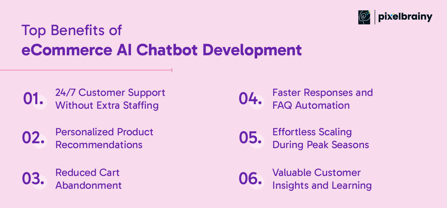 Below are six key advantages of developing an eCommerce AI chatbot and how it can transform your business: