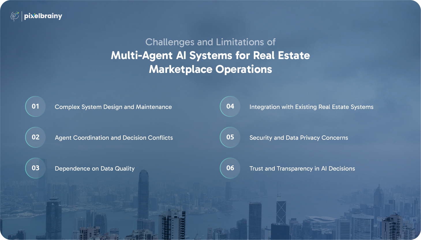 Multi agent AI systems bring powerful automation and intelligence to real estate marketplaces, but they also introduce practical challenges that businesses must plan for. These challenges are not barriers if addressed early through the right architecture, governance, and execution strategy.