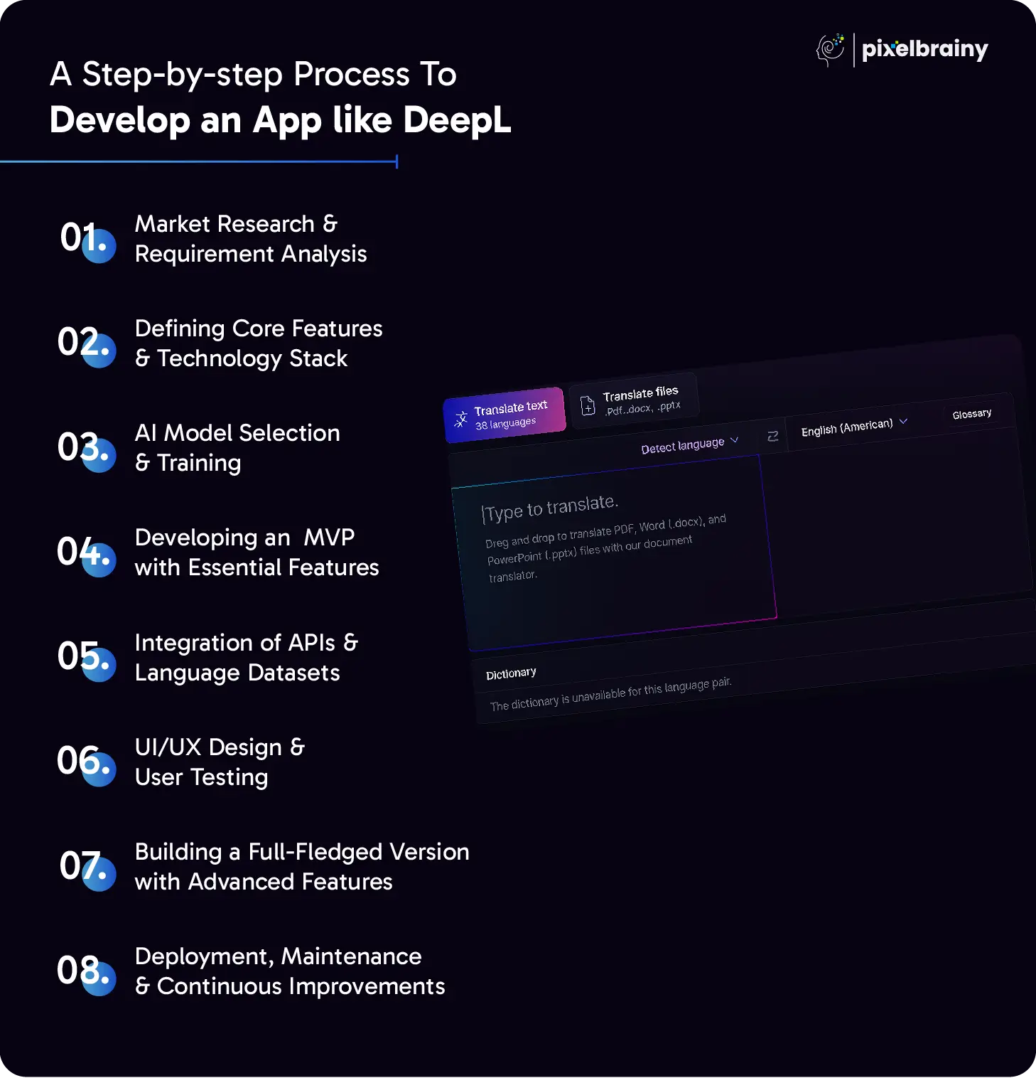 PixelBrainy is an ideal partner for building an AI translation app like DeepL. With expertise in cloud computing, AI, and secure software development, we build scalable, tailor-made, and high-accuracy translation apps that cater to industry requirements.