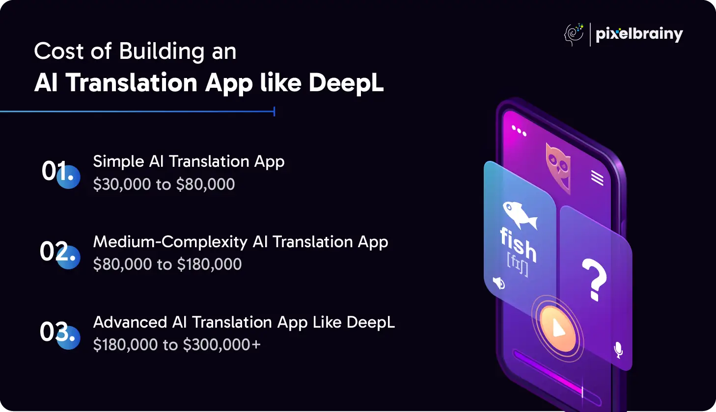If you were an enthusiast or a business person looking to build an AI translation app like DeepL, the first question that you would like to ask is: How much does it cost to build an AI translation app? The cost of AI translation app development, like DeepL, can range from $30,000 to $300,000, depending on the app’s features, integrations, AI complexity, and more factors (we will discuss this later in this post).