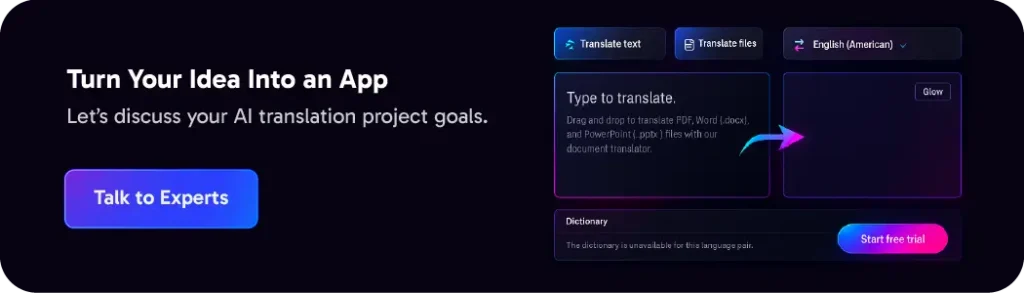 AI translation app’s neural machine translation (NMT) model is its backbone. You need large datasets, extensive fine-tuning, and robust GPUs to train a custom AI model and boost accuracy. Well, this process can be costly for you. Besides, you should also consider AI model training costs that depend on factors such as processing power, consistent learning mechanism, and data set quality.