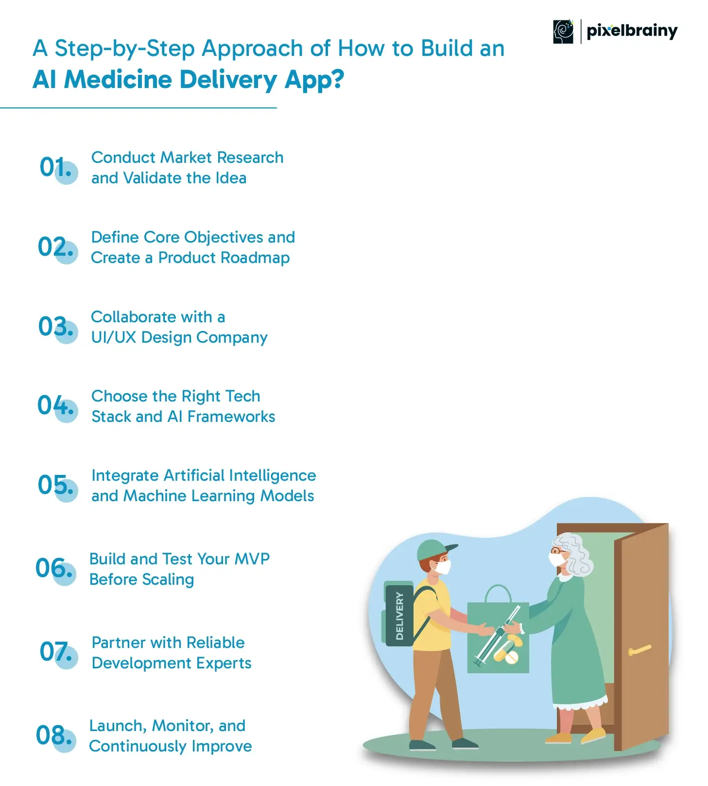 At PixelBrainy, we understand that building of AI Medicine Delivery App platforms is not just about development but about creating an ecosystem that grows with your users. We architect future-ready solutions designed for flexibility, allowing easy integration with new technologies like blockchain, IoT, and wearables.
