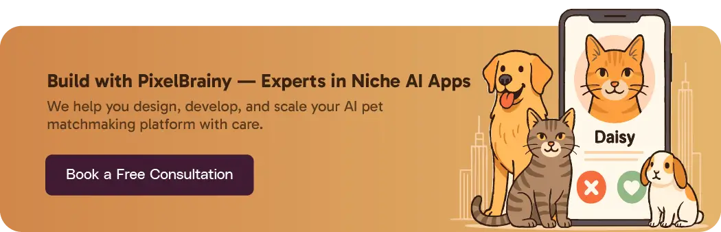 PixelBrainy stands out as a top AI development company in USA for those looking to build an AI pet matchmaking app. With years of expertise in delivering cutting-edge AI solutions, PixelBrainy ensures a seamless development process, from initial concept to final deployment. We specialize in creating highly personalized and data-driven apps, making our AI pet matchmaking app development services ideal for businesses seeking to revolutionize the pet adoption experience.