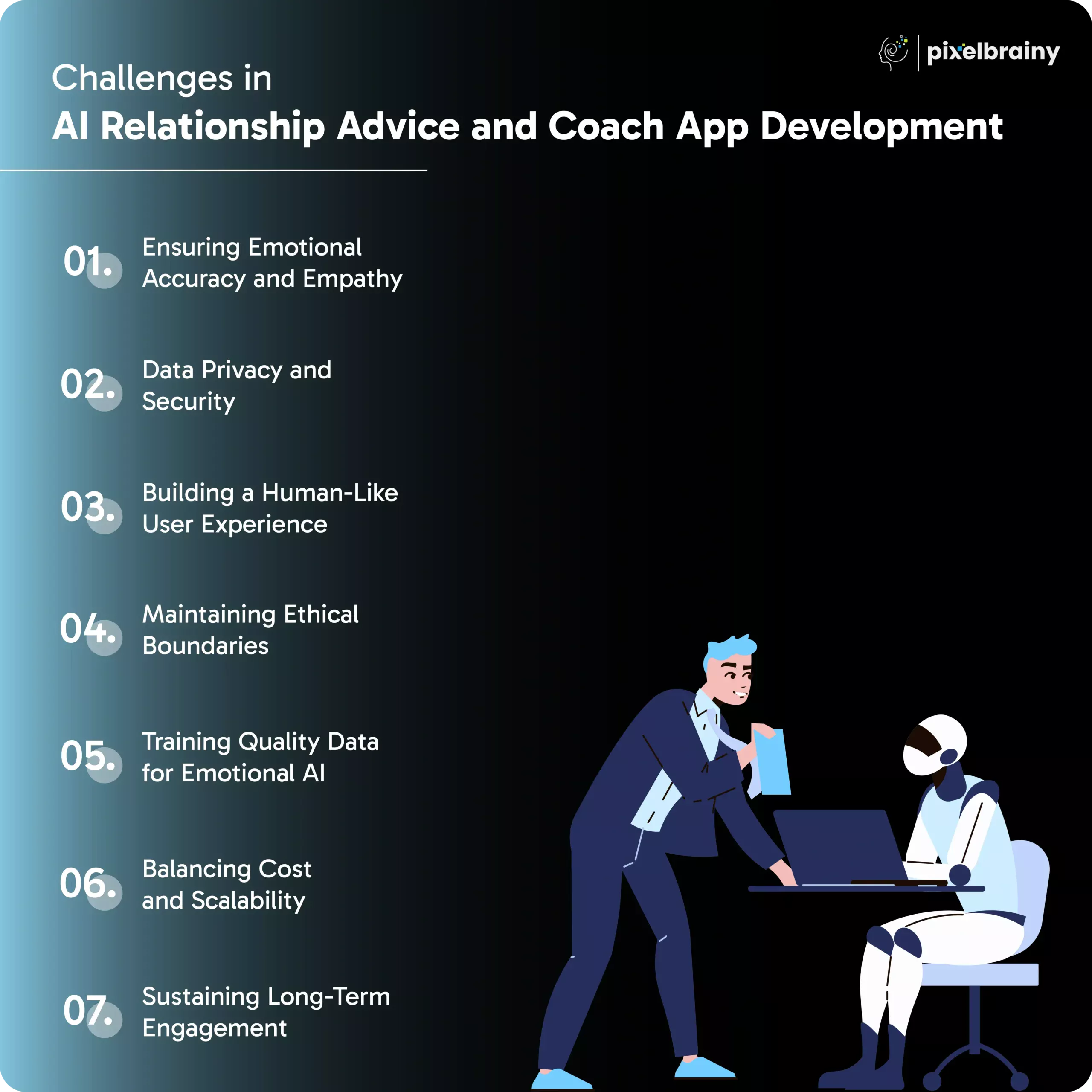 At PixelBrainy, we bring years of expertise in emotional AI, UX design, and app development to create AI Relationship Advice and Coach App solutions that feel truly human. Our goal is to turn your vision into a powerful, empathetic, and scalable digital product.