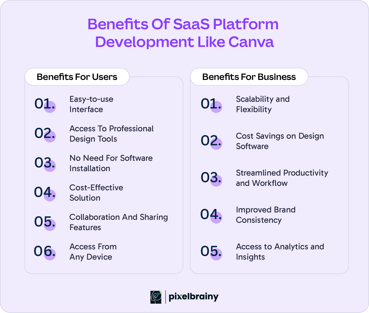 In this section, we will talk about the benefits of SaaS platform development, like Canva, separately for users and merchants.