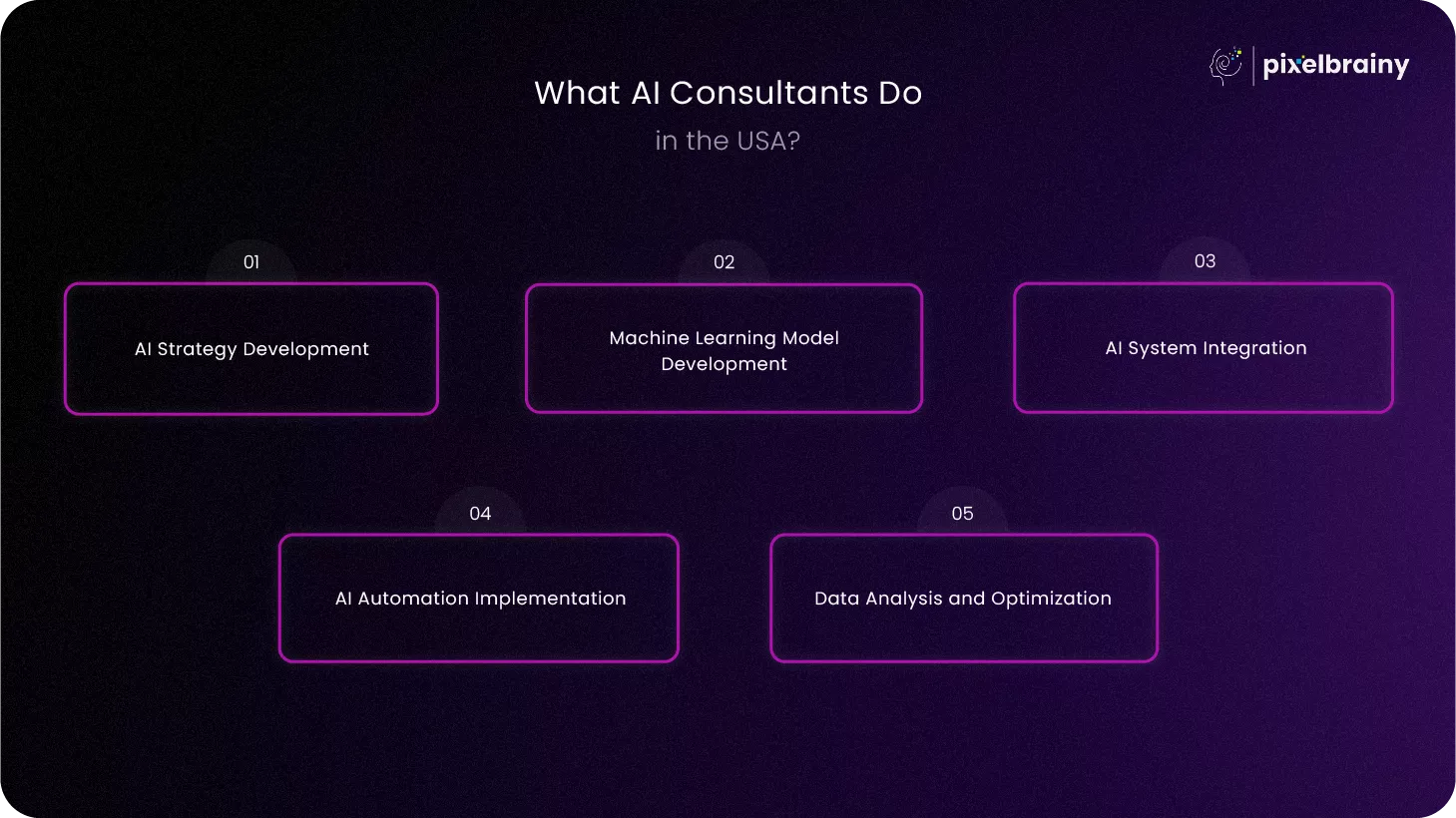 Organizations that plan to Hire AI Consultants from PixelBrainy LLC in USA or similar technology firms often expect comprehensive AI consulting services. These services typically include AI strategy planning, machine learning development, automation implementation, and data analytics optimization. Many businesses partner with experienced consultants or AI consulting companies to access specialized expertise in artificial intelligence development and enterprise AI solutions.