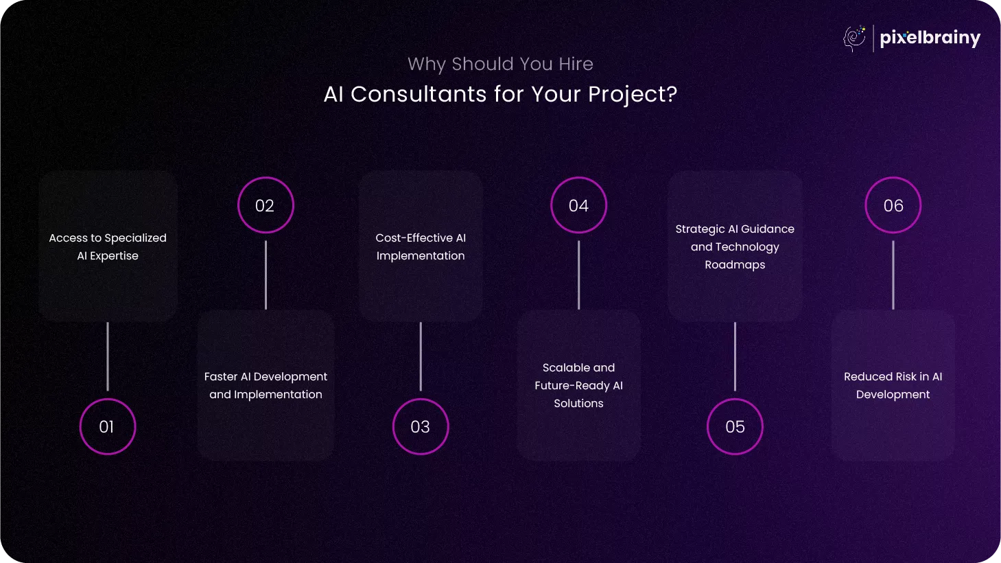 Companies that Hire AI Consultants from PixelBrainy LLC in USA often want to accelerate their AI initiatives. Dedicated consultants focus entirely on the assigned project, enabling them to implement agile development methodologies, streamline workflows, and rapidly develop AI-powered systems.