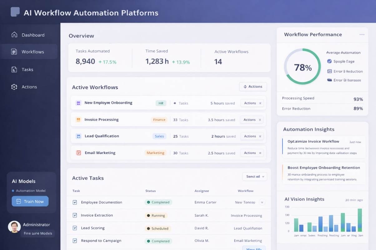 AI workflow automation platforms help businesses streamline repetitive processes across departments. These systems use machine learning and intelligent automation to manage tasks such as data processing, decision support, and operational workflows.